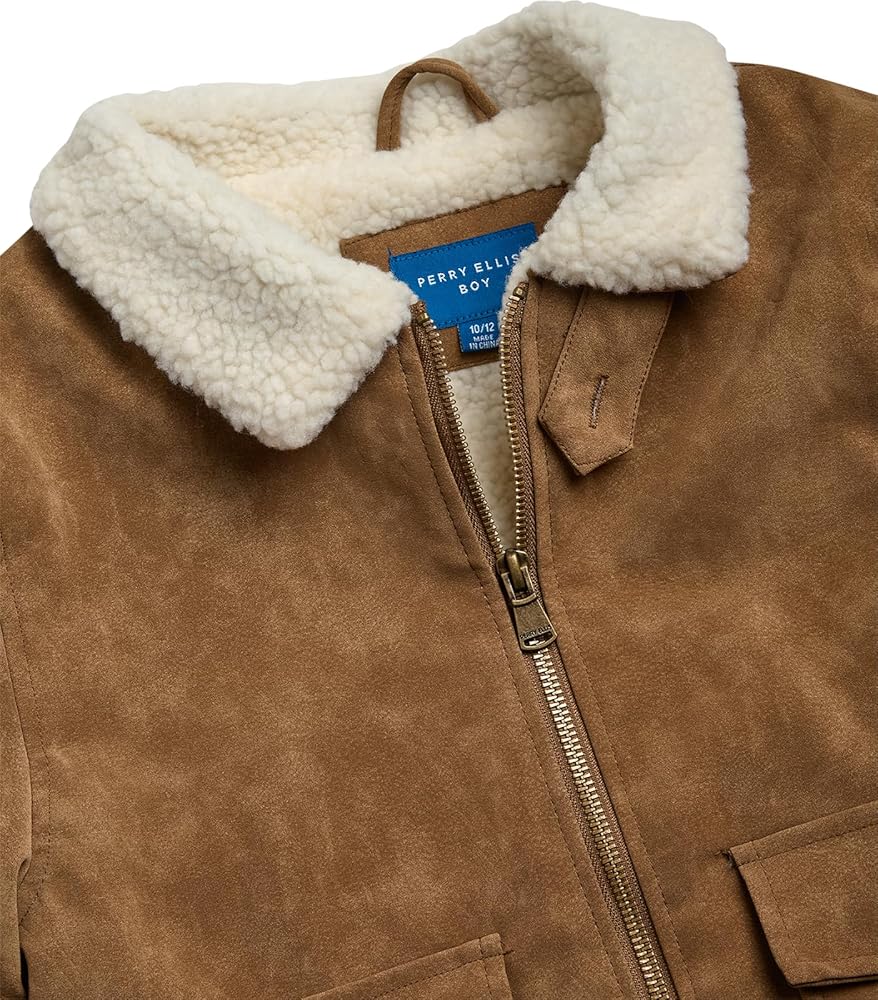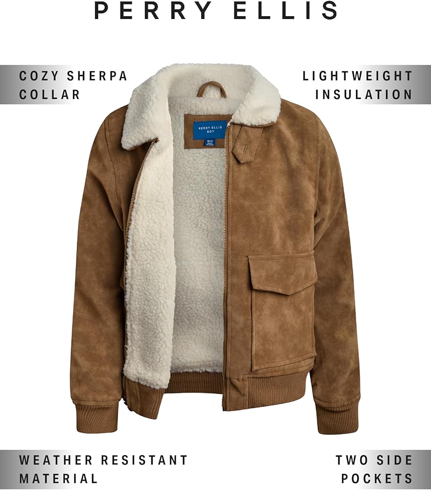 AVIATOR JACKET: Elevate your boy's style with Perry Ellis' Faux Memory Aviator Jacket. Crafted from durable faux leather, it exudes sophistication and is perfect for any occasion, adding a touch of cool to his look. Whether he's headed to school or out with friends, this jacket keeps him warm and stylish with its cozy lining and classic aviator design.