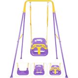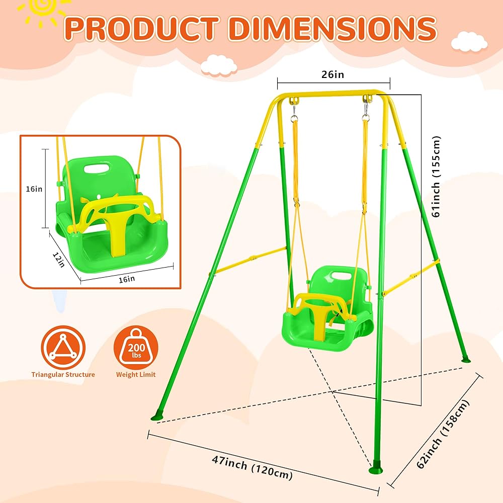 【Sturdy & Safe】Baby swing set is designed based on the triangle structure, ensuring the whole structure's stability. It is made of strong steel that is safe and durable for children and has a smooth powder-coated surface to ensure quality and safety. The swing set fits 6 months-10 years old kids and can accommodate up to 200 lbs.