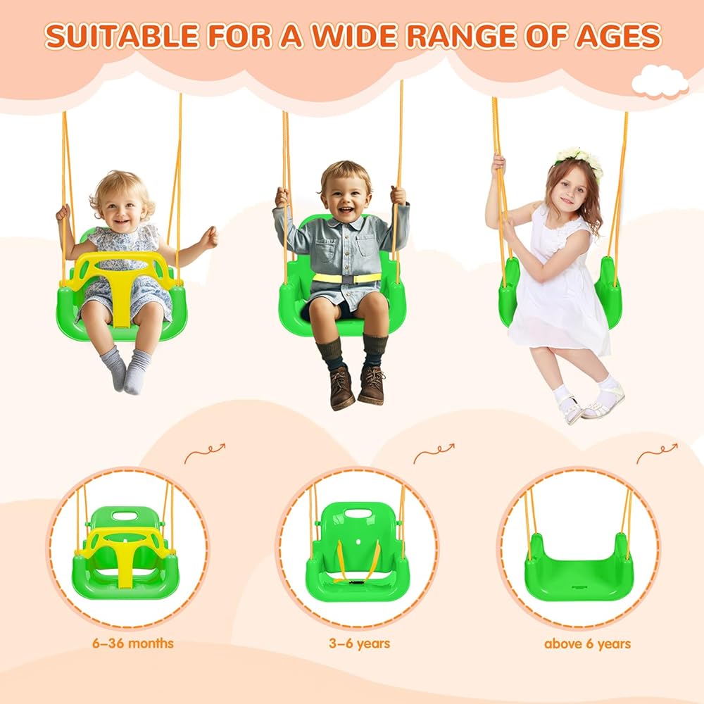 【3 in 1 Toddler Swing】Our swing seat uses a removable 3 in 1 design, which can be converted into different modes as your child grows; It's suitable for toddlers aged 6 months-10 years. This toddler swing set will accompany your child in enjoying outdoor fun and help improve their balance, and develop coordination and exercise abilities.