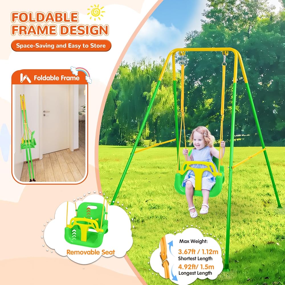 【Easy Assembly & Convenient Storage】Assemble the swing set in just 30 minutes with the provided instructions or video guide. It's a delightful family activity, involving both parents in creating a surprise for the baby. The portable baby swing has a foldable design, and the metal stand is easy to store and transport. Your baby can have fun with this swing set in the living room or any preferred location.