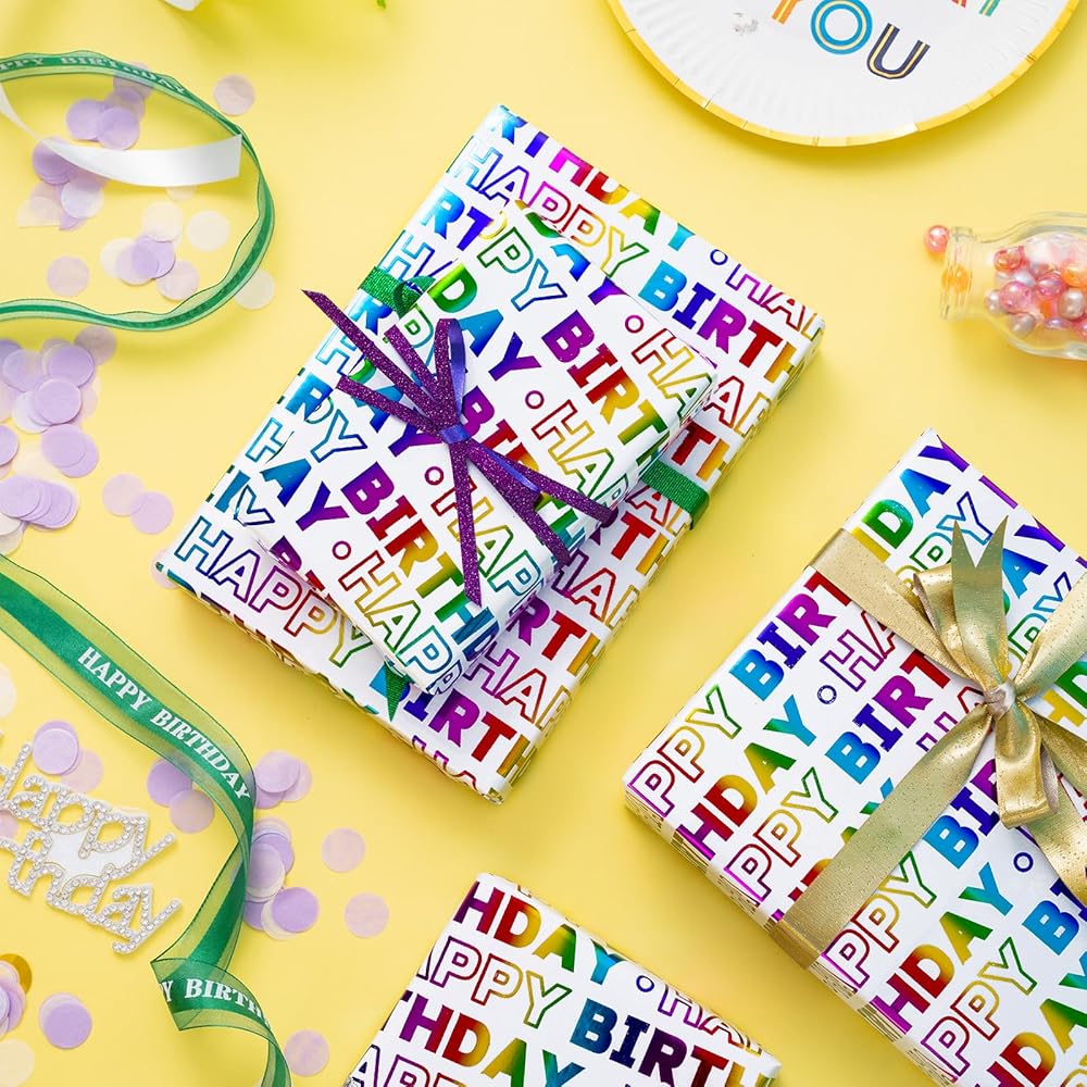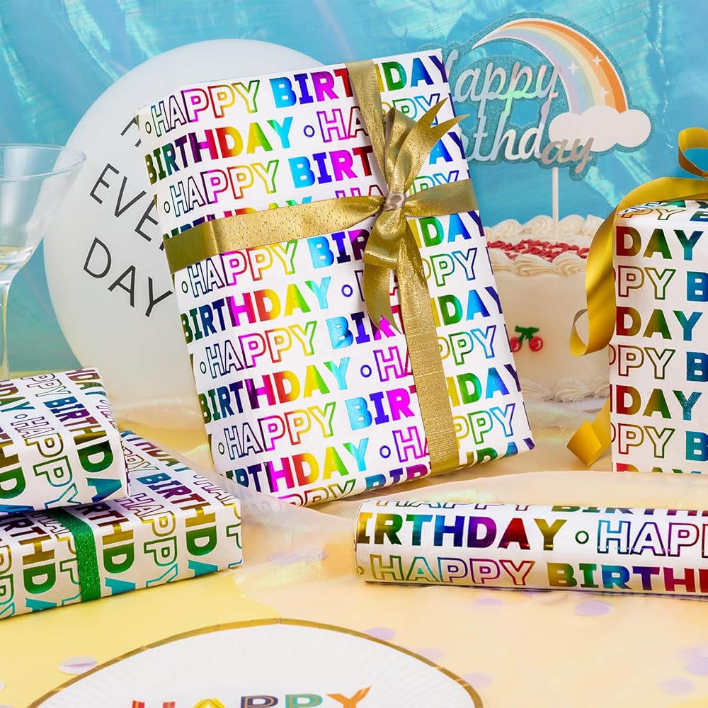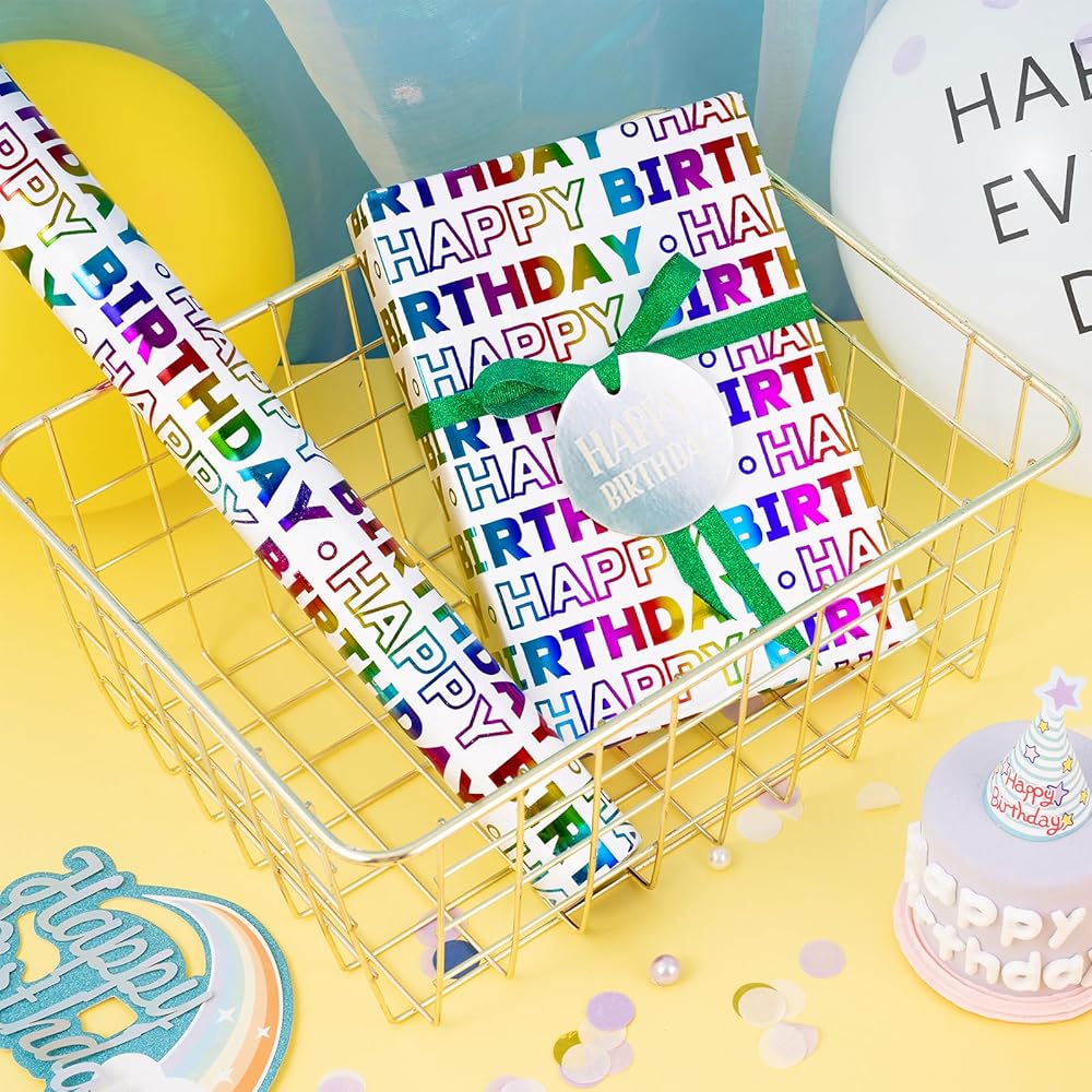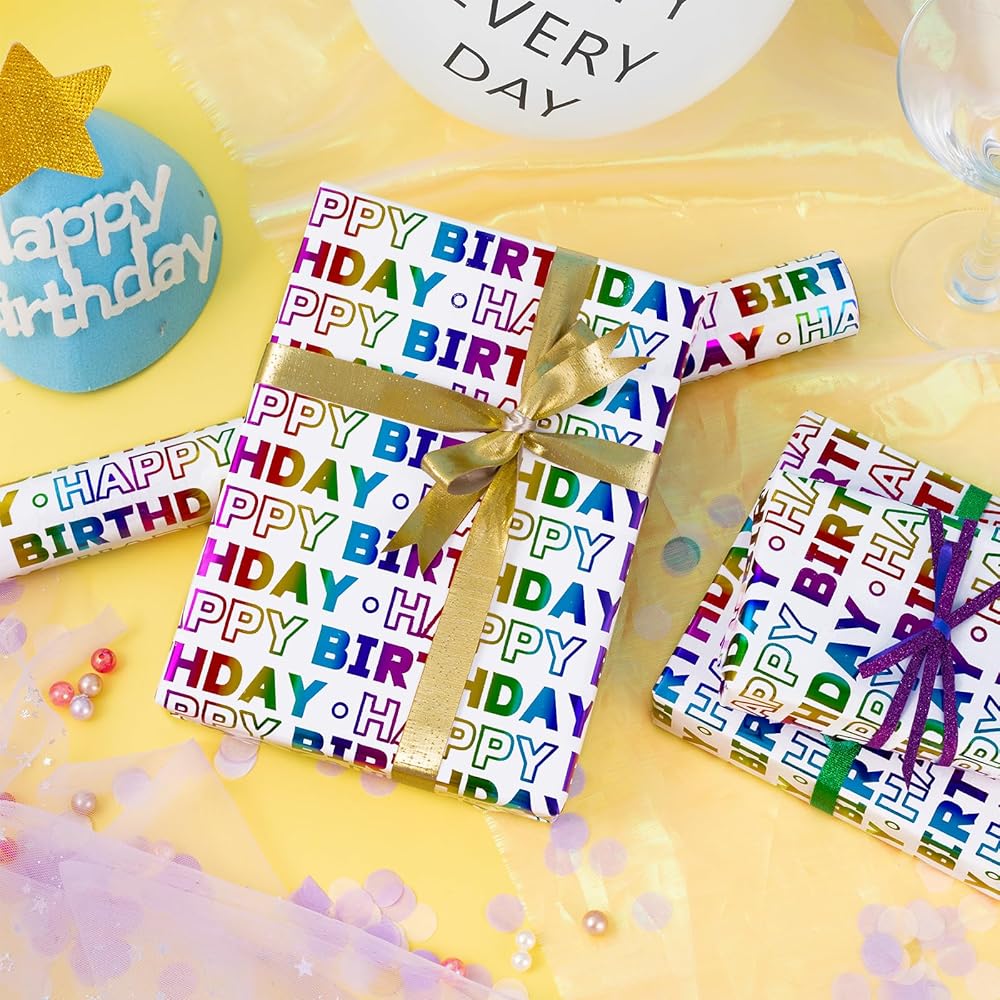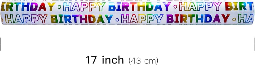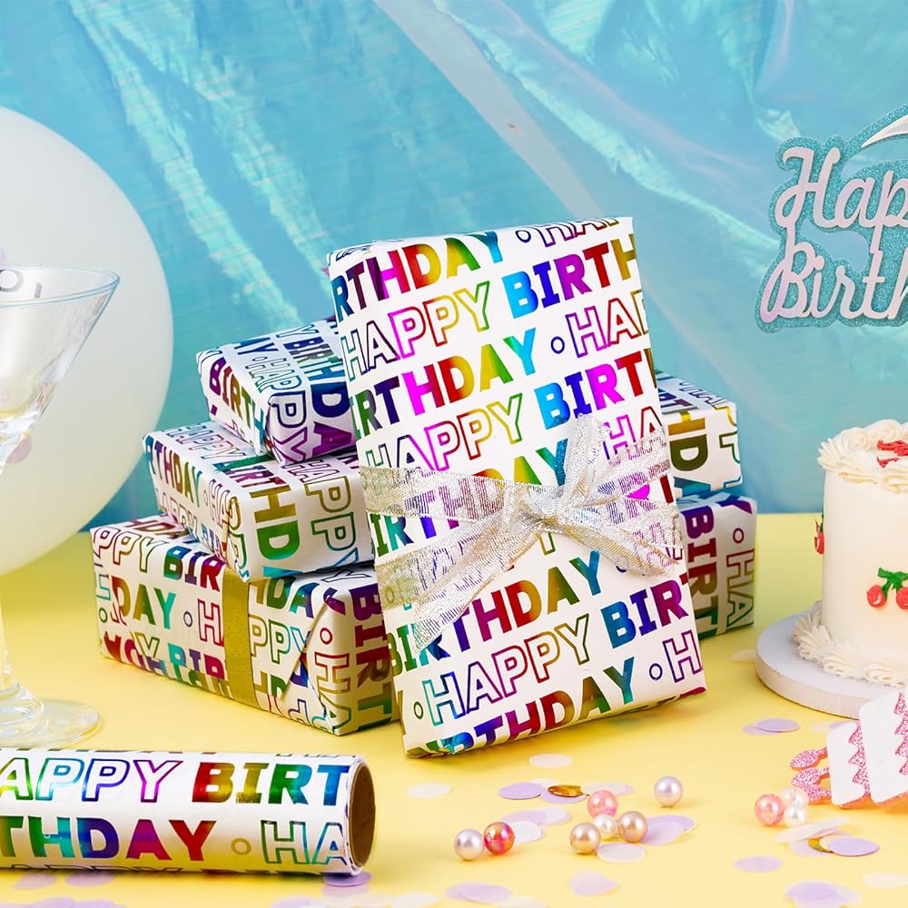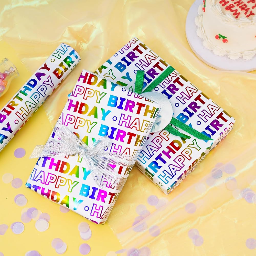 LeZakaa Birthday Wrapping Paper Roll, Happy Birthday Lettering Colorful Holographic Foil Design for Baby Shower, Holiday Party Gift Wrap, Mini Roll, 17in x 16.4Ft