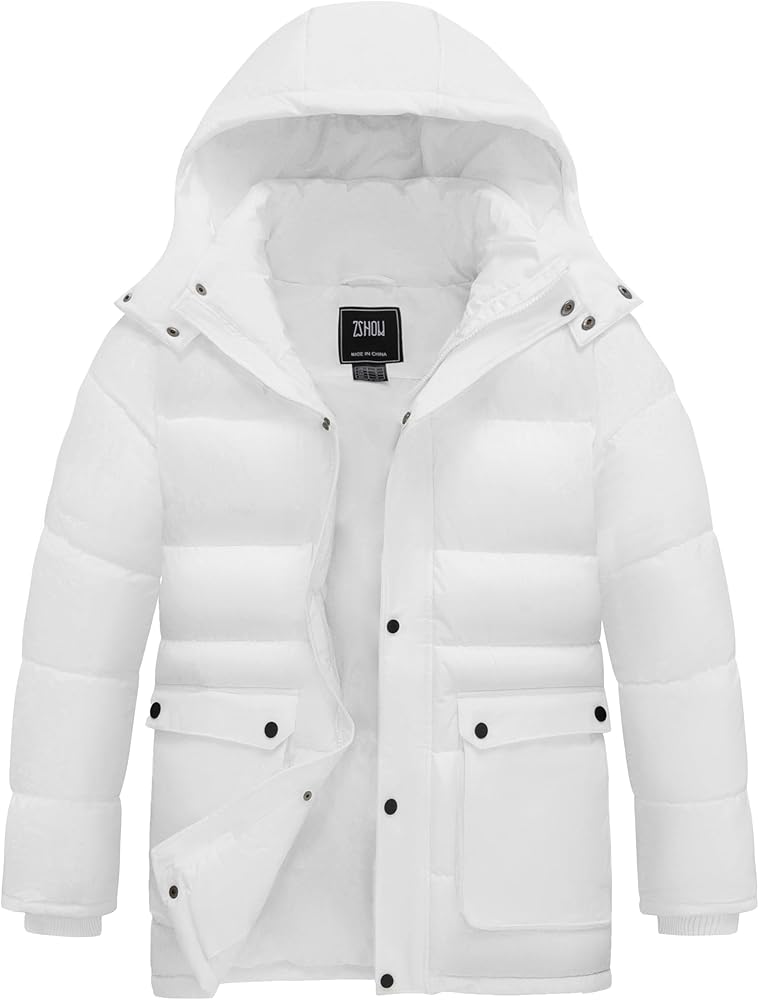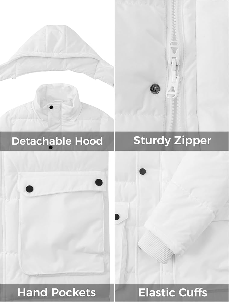 Windproof Parka for Men - The men's puffer coat features a stand-up collar,a detachable storm hood and elastic ribbed cuffs, which won't let a cool breeze bother your body.The front zipper of this men's jacket is designed with button placket,which could keep the wind out and stay warm all day.