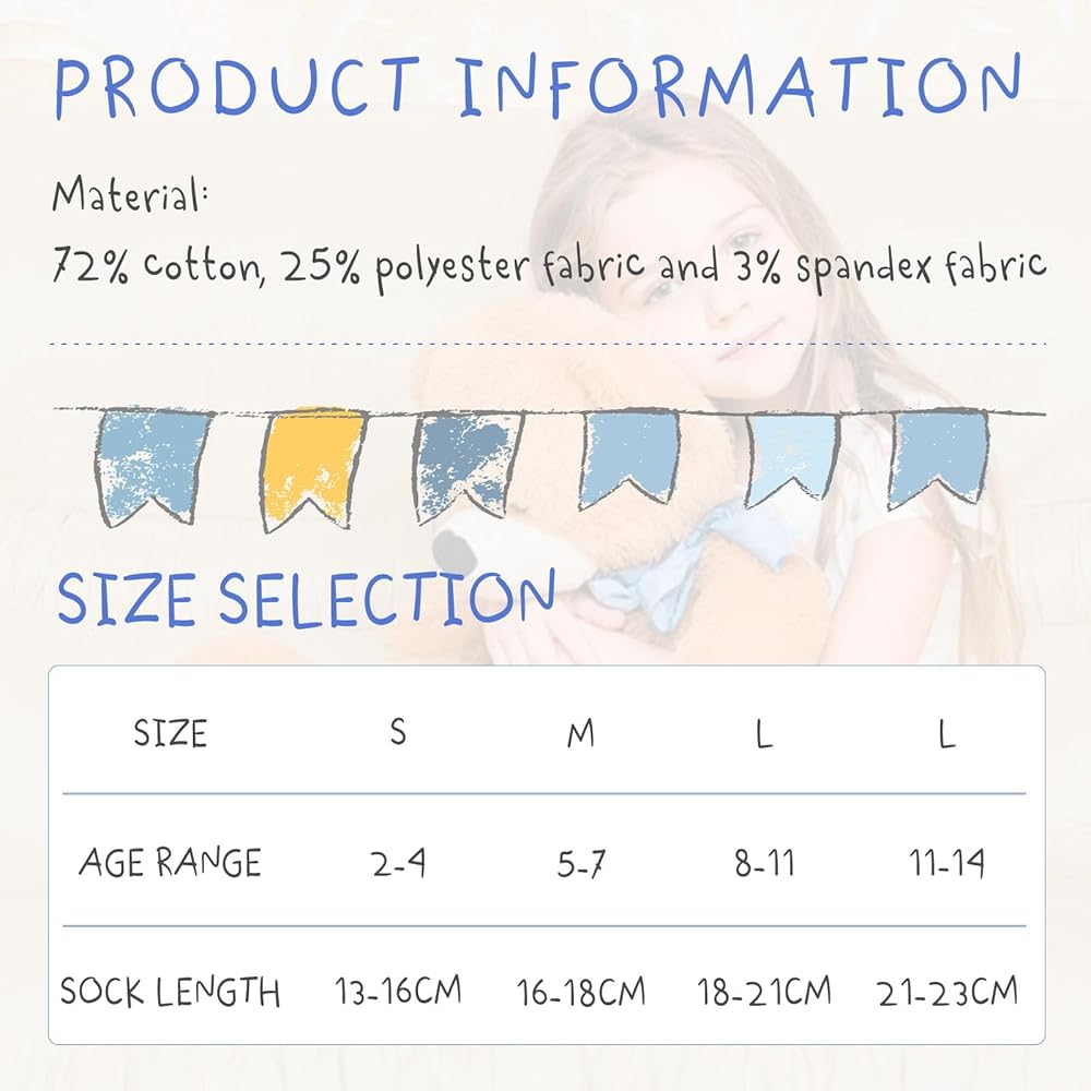 Versatile for All Ages: This fashion children cotton socks design for different age We offer variety of size for your choice,2-4 Years old,5-7 Years old, 8-11 Years old, 11-14 Years old.