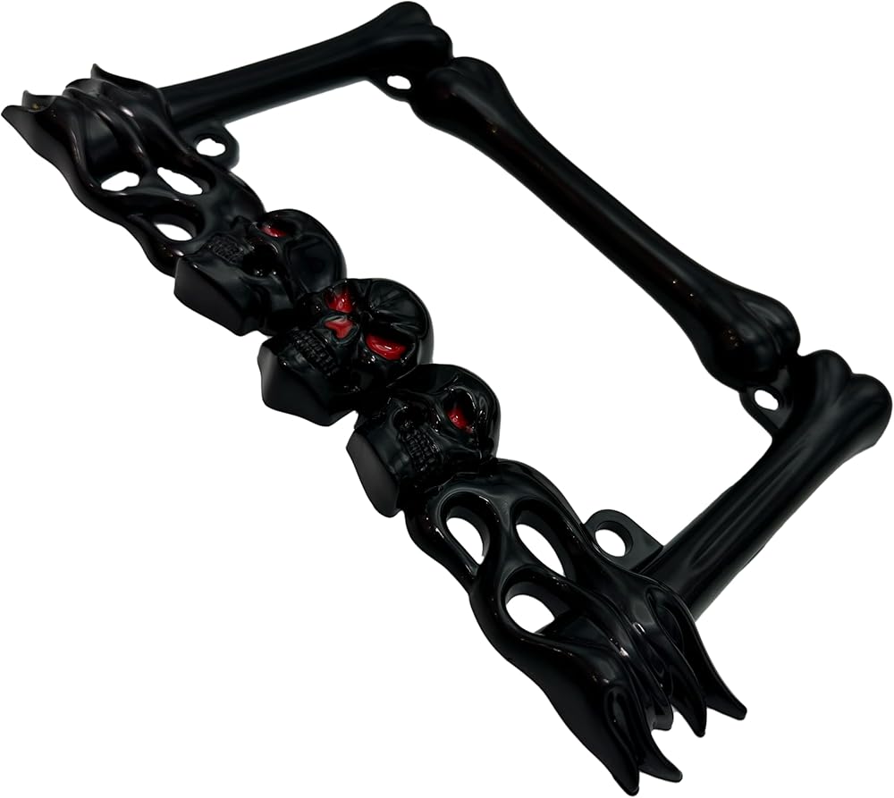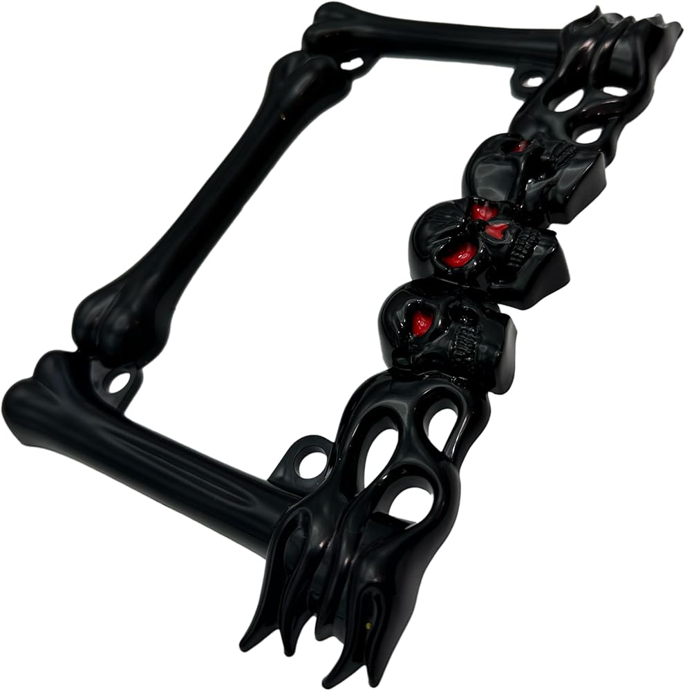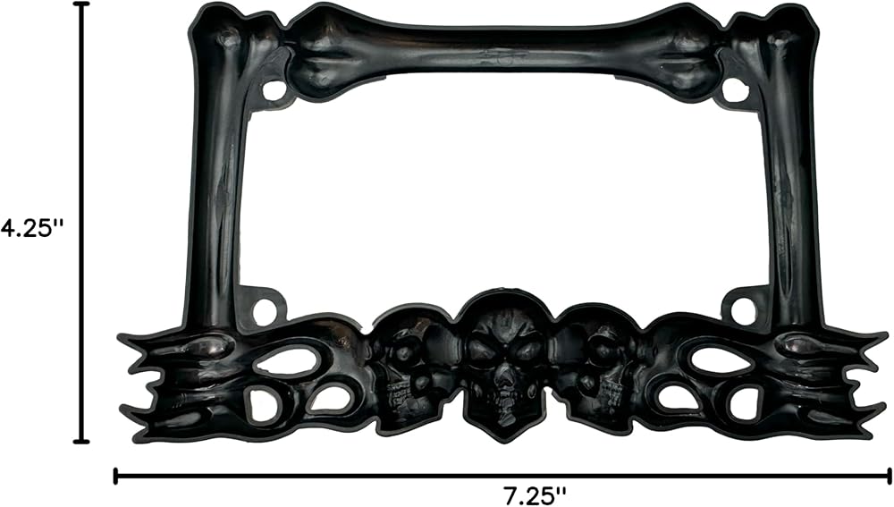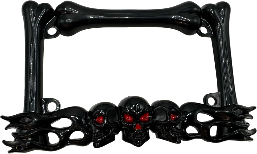 2. The chrome finish ensures long-lasting shine, resisting wear and corrosion even in harsh conditions. The bold skull and flame design features red reflective eyes, providing an extra layer of visibility at night while exuding an edgy, custom look. This Zinc Diecast Satin frame fits all standard US 7" x 4" license plates, making it perfect for Harley or custom choppers.