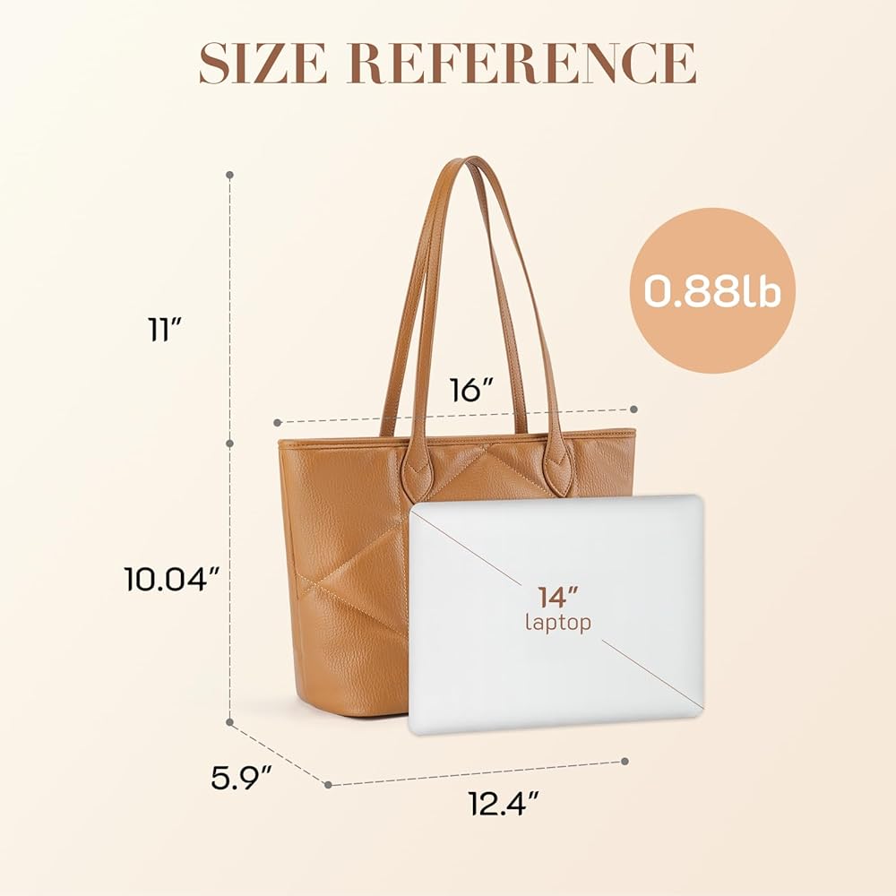 Spacious & Lightweight: Measuring 12.4'' L x 5.9'' W x 10.04'' H, this tote purse includes 1 main zip pocket, 3 internal pockets, and 1 back zip pocket. It's spacious enough to accommodate a 14'' laptop, phone, wallet, and cosmetics, while the inner pockets keep your cards, keys, and coins organized, and the back pocket secures your valuables