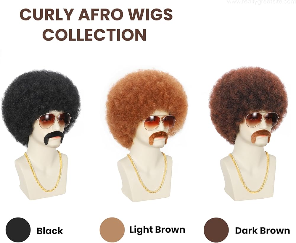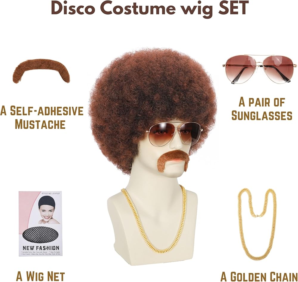 Package Include: 1*Perfect disco style Afro wig+1*Sunglasses+1*Golden Chain+1*Self adhesive mustache+1*Wig cap, which really makes things realistic
