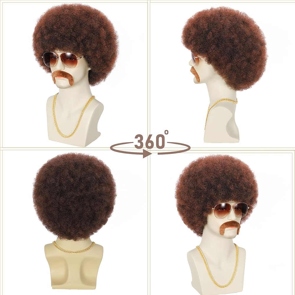 5Pcs Set Disco Style Afro Wig for Men 70s/80s Theme Parties, Curly and Fluffy Costume Wigs with Synthetic Hair, Hippie Rocker Afro Wig for Cosplay/Halloween/Dress up (#33 Dark Brown)