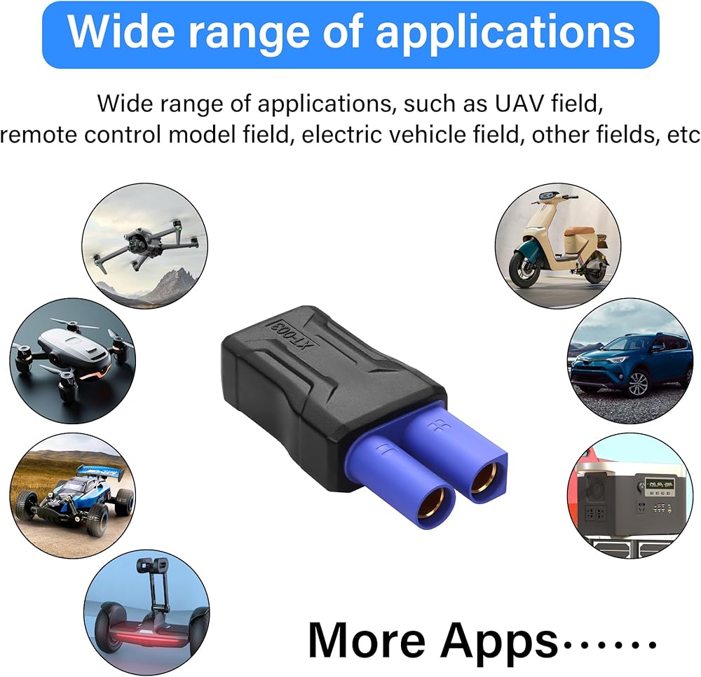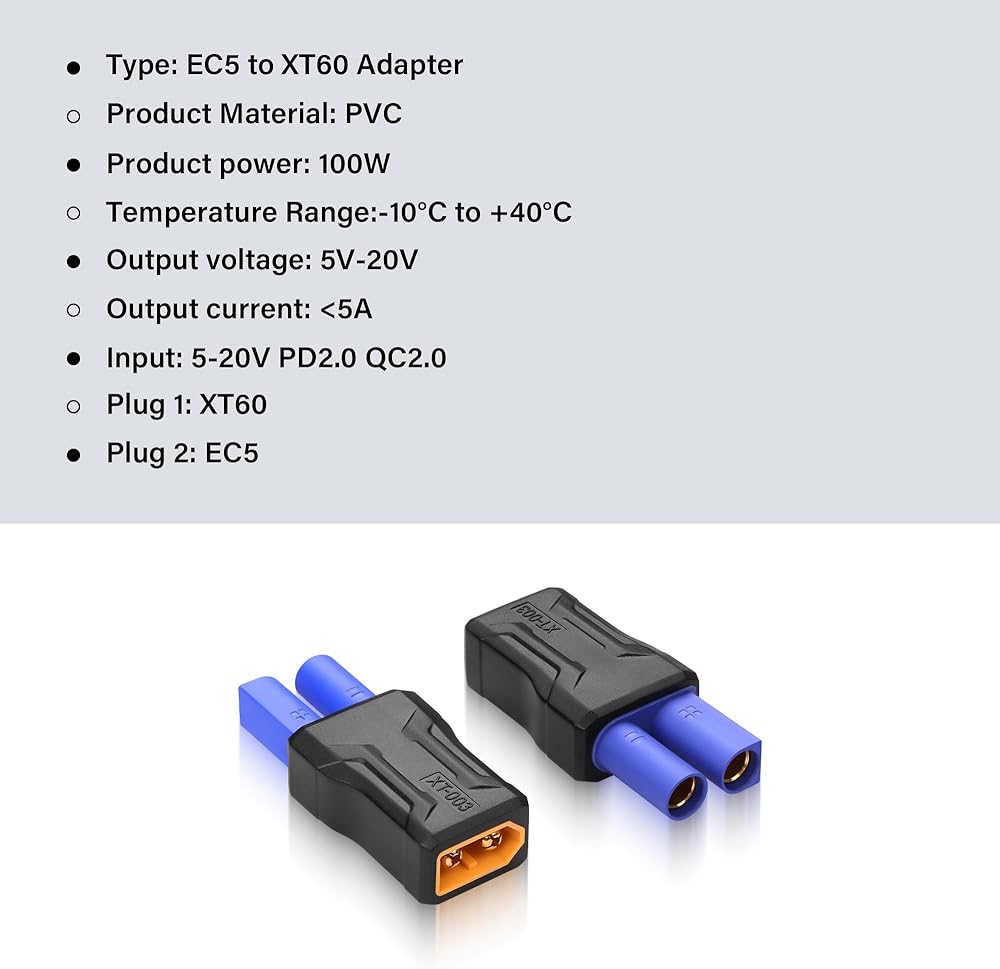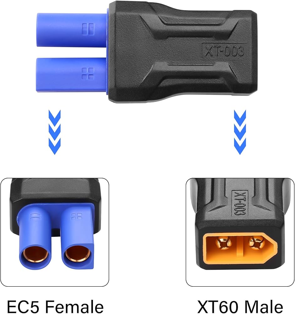 EC5 to XT60 adapter use for convert battery with XT60 to EC5 on ESC / charger,allows you to use your batteries that have a XT60 style connector with an ESC that has an EC5 Connector on it.