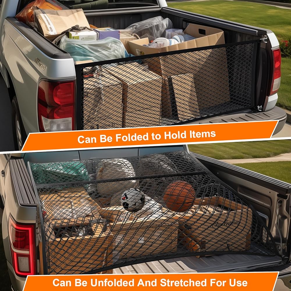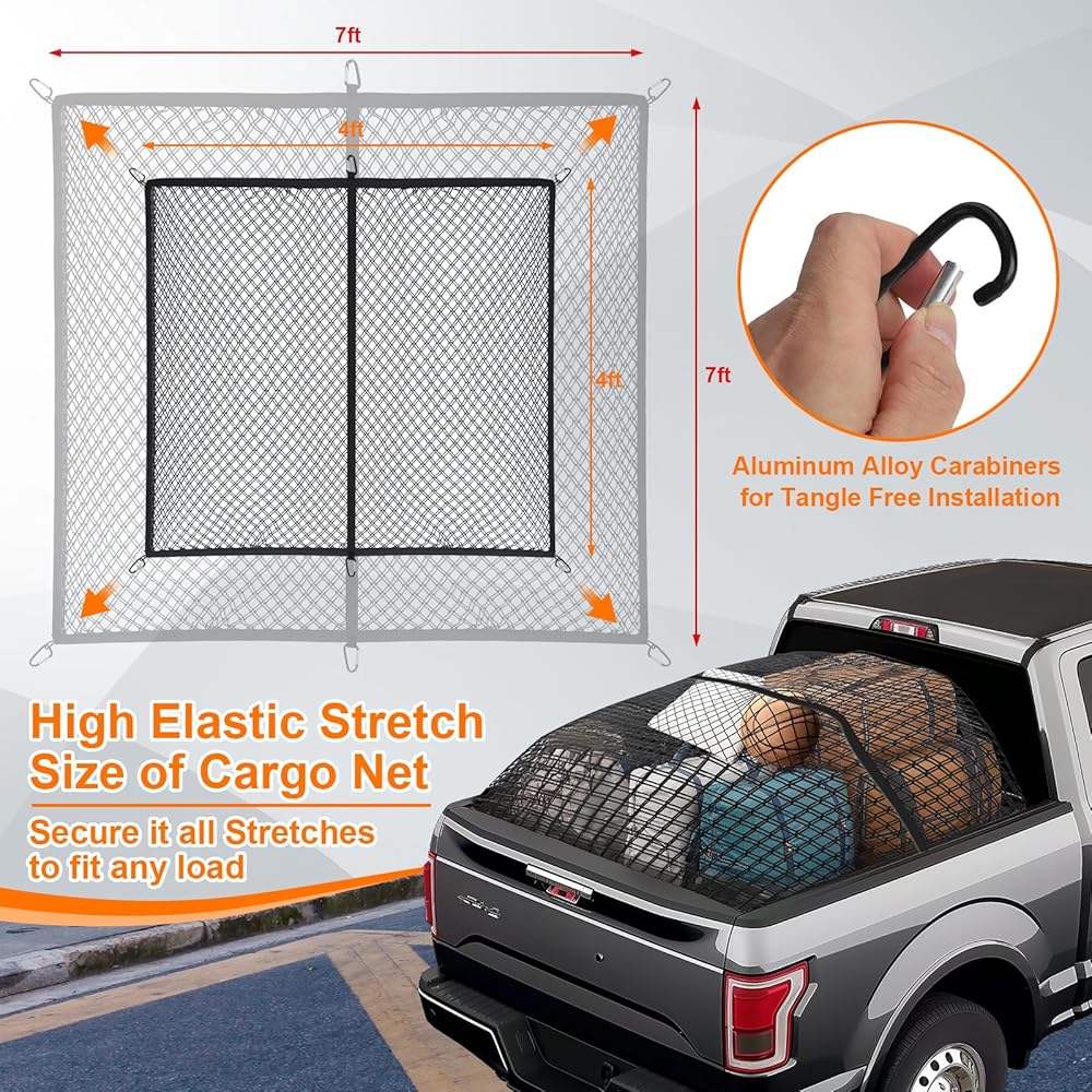 🚗【STRETCHABLE AND EXPANDABLE】This cargo net for pickup truck bed is designed with tight 4” x 4” mesh and reinforced mesh joints and ultra-fine 1.37”x1.37” mesh netting, which can be stretched to 7”x7” cargo net for truck bed organizer to can be used in 2 ways. You can either cover the cargo with the truck cargo net to secure them or fold the truck cargo net to keep small items from falling and provide added strength and protection for large cargo during transportation.