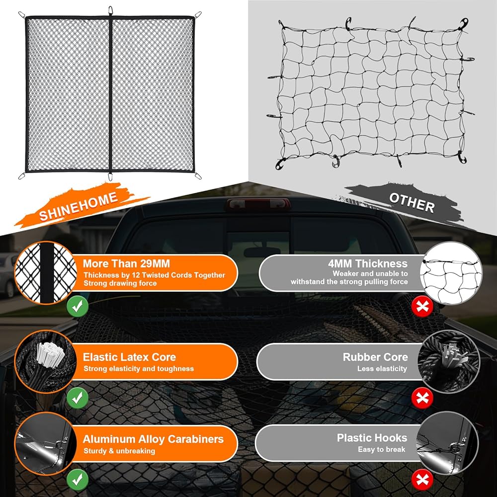 SHINEHOME Truck Bed Net Cargo Net for Pickup Bed Cargo Net Organizer with 8 Metal Carabiner for Ford F150 Tacoma Silverado Ram 1500 Tundra Truck Accessories - Doube Layer