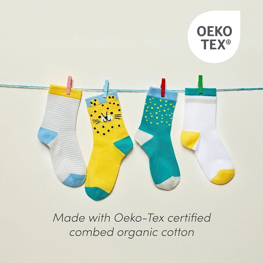 • PATTERNED CREW SOCKS - Offer safety & comfort with non-skid BPA-free grips, seamless toes, and soft, breathable organic cotton. Fun, patterned socks with color-coded heels & toes promote independence, while tag-free size labels prevent mismatches