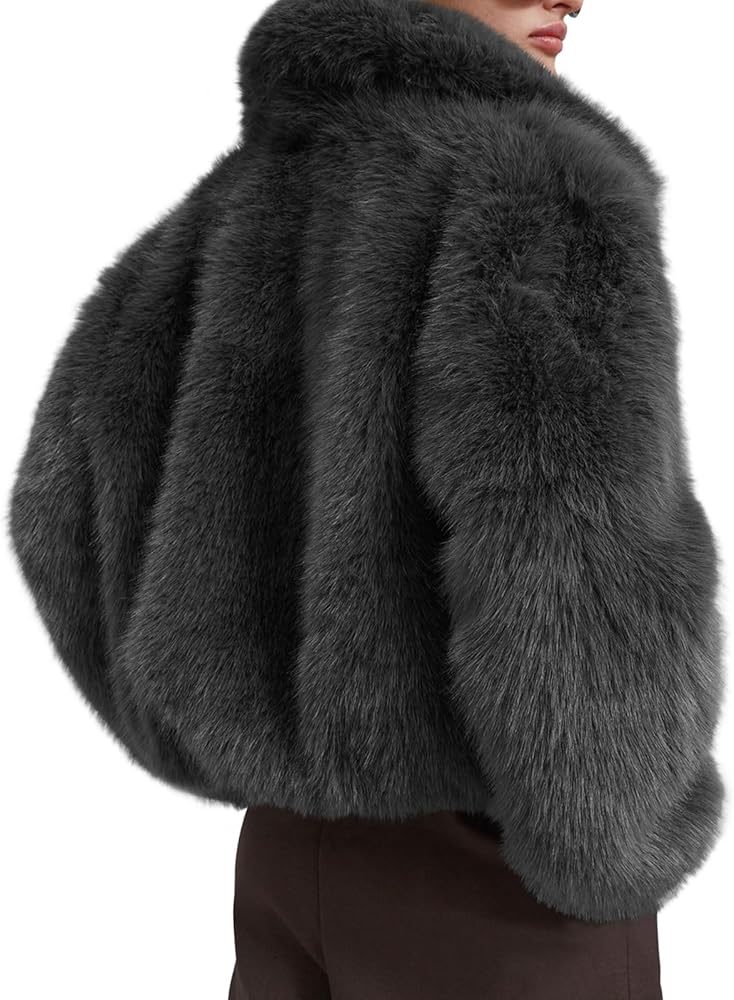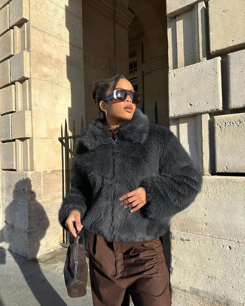 Tankaneo Womens Cropped Faux Fur Jacket Shaggy Lapel Zip Up Winter Coats Fuzzy Warm Outerwear