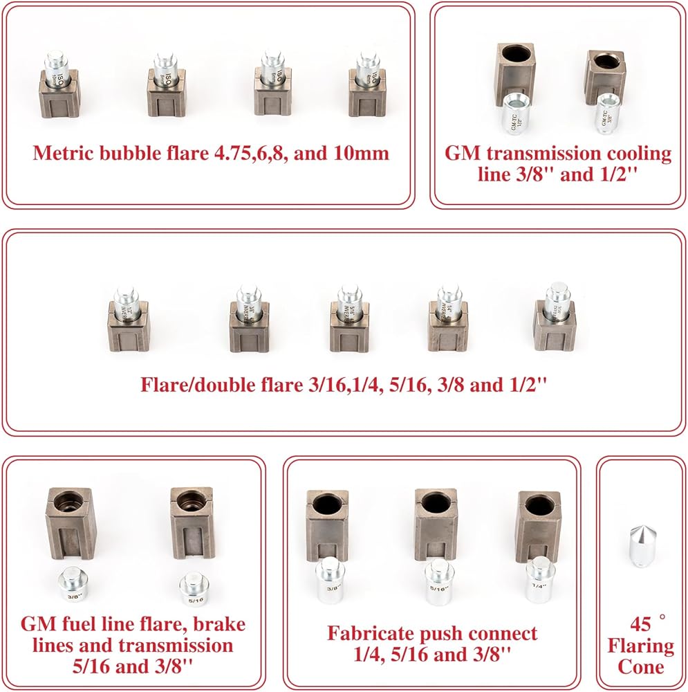 INCLUDES dies and adapters to fabricate push connect 1/4, 5/16 and 3/8"; GM fuel line flare, brake lines and transmission 5/16 and 3/8"; flare/double flare 3/16, 1/4, 5/16, 3/8 and 1/2"; metric bubble flare 4. 75, 6, 8, and 10mm; GM transmission cooling line 3/8" and 1/2"; mini tube cutter for 1/8" to 5/8" (3 - 16 mm) O. D. tubing (1/8 to 1/2" nominal) all packaged in a custom blow molded case