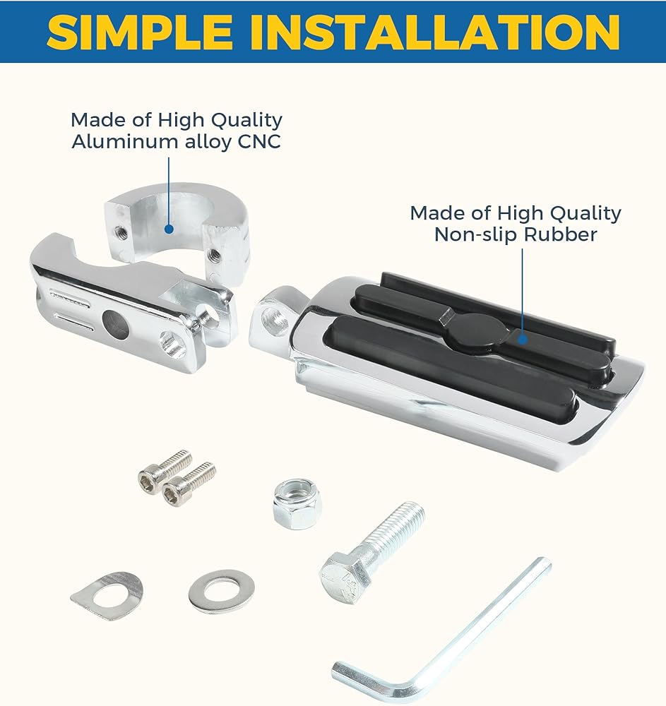 [Easy to Install] Equipped with all the necessary installation Allen wrenches, it is convenient for you to remove and install, and the operation is simple.The mounting clamps firmly grasp the engine guard, and the locking design fixes the foot pegs at the desired angle.