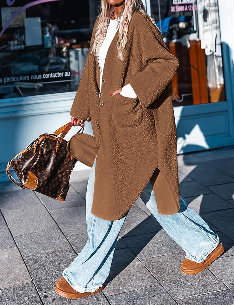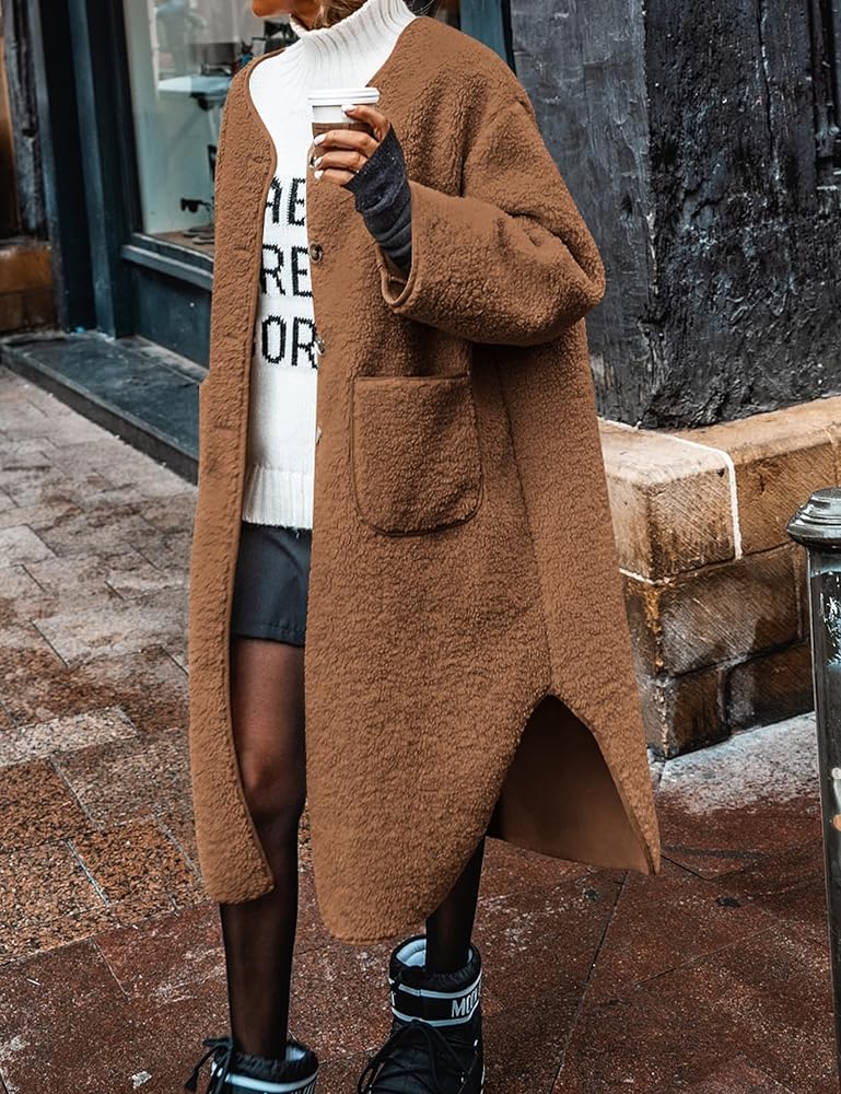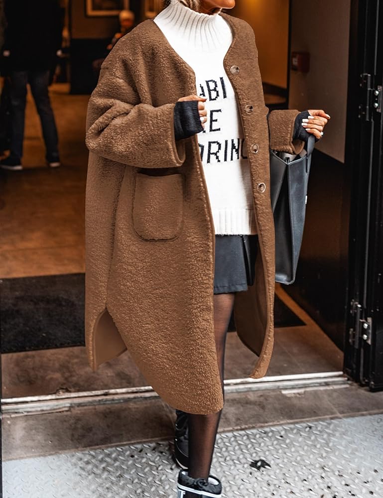 Feature: Fluffy Sherpa Jackets , Winter Crew Neck Faux Fur Long Coat, Button Down,Two Side Pockets, Womens Casual Oversized Jackets, Fuzzy Fleece Shearling Coats, Shaggy Teddy Coat,Winter Clothes for Women