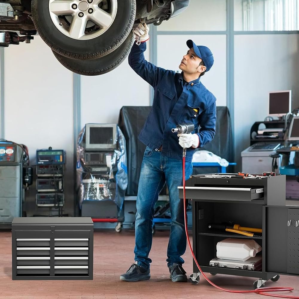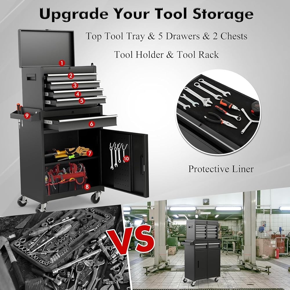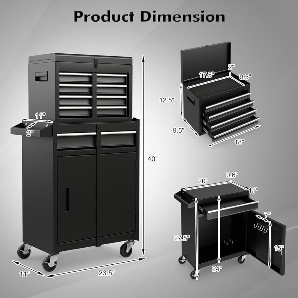 Description:One of the standout features of this product is its detachable toolbox, which allows users to conveniently transport their most frequently used tools to different work areas. The tool combination cabinet also features multiple drawers with lockable mechanisms, ensuring the security of your valuable tools and equipment. Crafted with durability in mind, this garage workshop rolling tool cabinet is constructed from high-quality materials that guarantee long-lasting performance. Its sturdy design provides stability, even when fully loaded with heavy tools. Additionally, the smooth-rolling wheels make it easy to move around the workspace, offering flexibility and convenience during projects.Features:Five drawers, two trays, a large bottom cabinet and a top box drawer, large storage capacityFour 360-degree revolving universal wheels, two of which have brakesLarge load capacity, a drawer can load 11 lbs, a total load is up to 220.5 lbsSteel material for cabinet body, firm and durableEVA mats in each drawer and at the top of lower box to protect your tools anti-slipFive drawers with slide rails, which operate smoothly without stickingThere are four hooks for hanging tools on the side doorHumanized handle design for convenient to move tool combination cabinetSpecification:Color: Black/ Red+Black / Blue+Black/ RedMain Material: Steel, rubber-plastic synthetic wheelOverall Dimension: 23''x11''x40.5''(LxWxH)Upper Case Dimension:17.5'' X 9.5'' X 13'' (LxWxH)Lower Cabinet Dimension: 23'' X 11'' X 27.5''(LxWxH)Weight Capacity of Each Drawer: 11lbsTotal Weight Capacity: 220.5lbsNet Weight:38lbsPackage includes:1 X Tool Combination Cabinet