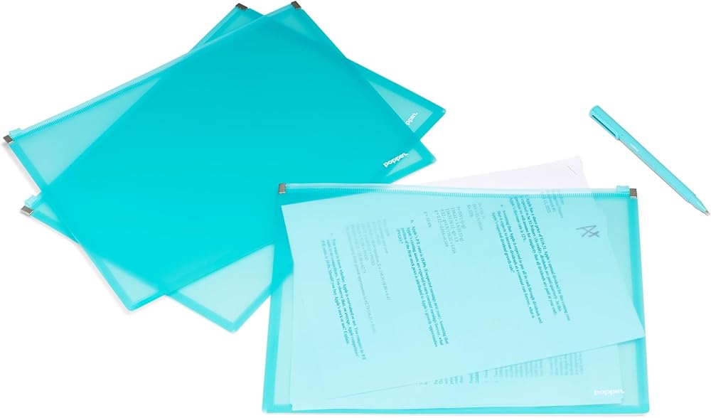 This set of 3 zipper pouches is perfect for all of your document storage needs. Each document storage bag includes a slide tab zipper on the top. This set of zipper pouches is available in two sizes - the letter-sized pouches measure 12.75" wide by 10" high, and can hold up to 120 pages of standard letter-sized sheets of paper. The half-letter-sized pouches measure10.25" wide by 6" high, and are designed to hold folded letter-sized sheets of paper. The transparent front of each folder allows you to easily view your documents, making it easy to stay organized and know which folder to grab. These zipper pourches are water resistant, as well as tear resistant. They are durable and will hold up to daily use over the long term. Your documents will be protected from coffee and water spills. Designed by Poppin in NYC, these zipper pouches are designed to coordinate perfectly with the full range of Poppin office supplies, from pens and notebooks, to desktop storage trays, to staplers, and more.