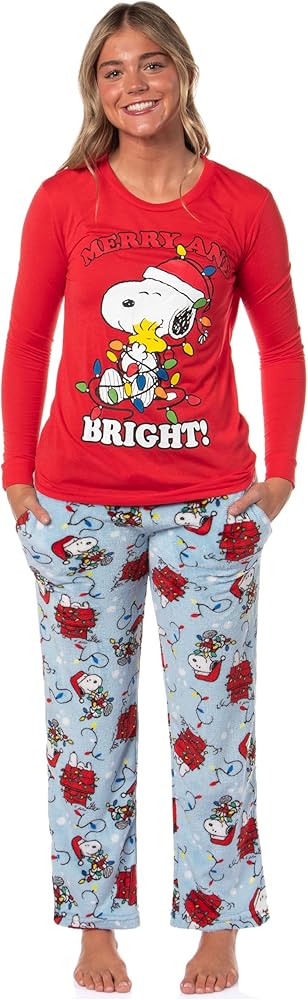 Stay cozy and festive this Christmas with these matching family pajama sets featuring Snoopy and Woodstock. Inspired by the timeless Peanuts series, each set is crafted from 100% polyester for comfort and durability. The adult sets include cozy fleece pajama pants with an adjustable drawstring waistband, featuring an all-over print of Snoopy in playful poses with a Santa hat and Christmas lights. The men's and kids' sets come with a blue long-sleeve top, while the women's and toddler sets have a red top, all adorned with a cheerful graphic of Snoopy and Woodstock hugging, wrapped in Christmas lights, with the text "Merry and Bright!" The infant style is a one-piece fleece-footed sleeper with a matching beanie featuring Snoopy in festive poses, perfect for keeping your little one warm.