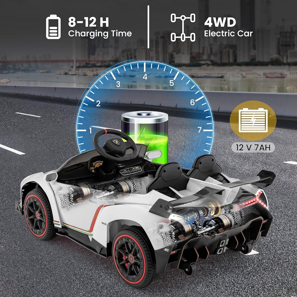 【High Performance Ride-On Car】: Featuring double hydraulic doors and 4 powerful motors, this 4WD electric car for kids delivers the same high-performance experience as a real Lamborghini. Your child will be thrilled by the speed and agility of this electric vehicle, making it perfect for adventurous playtime.