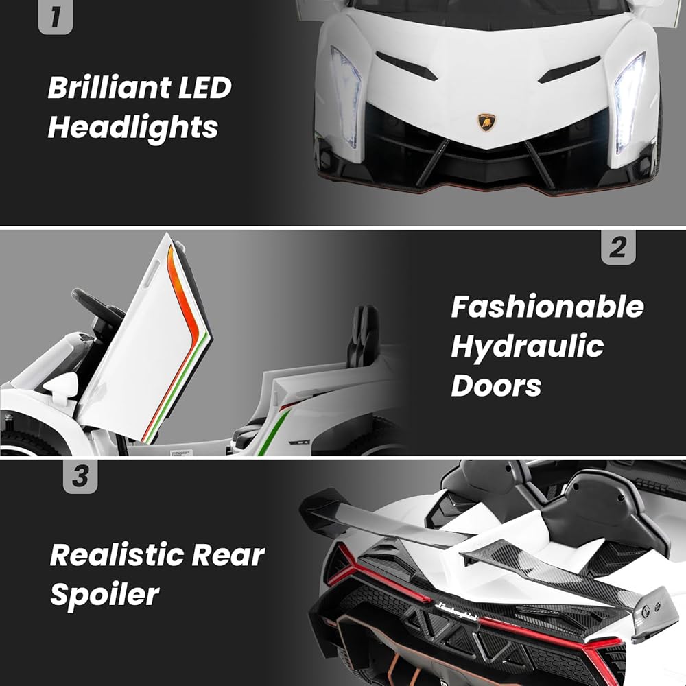 【Perfect Gift for Kids】: This officially licensed Lamborghini ride on car not only offers an immersive driving experience but also stands out with its stylish design. With brilliant LED headlights, fashionable hydraulic doors, and a realistic rear spoiler, this HONEY JOY ride on car exudes an authentic and eye-catching appeal for kids ages 3+ years old.
