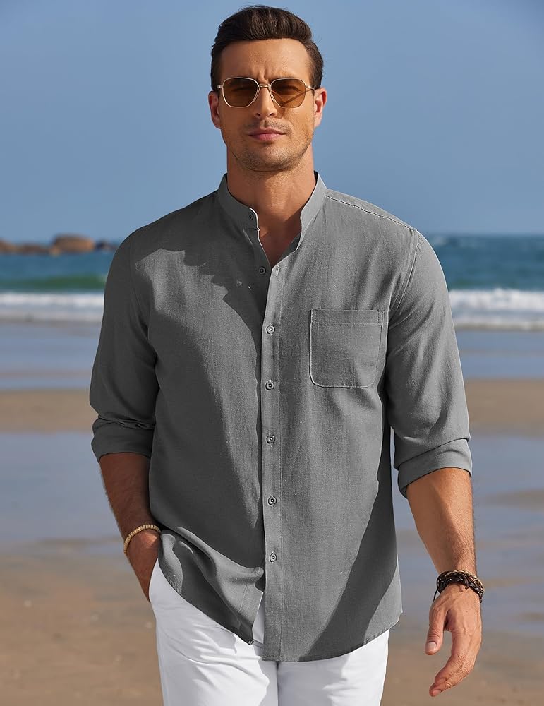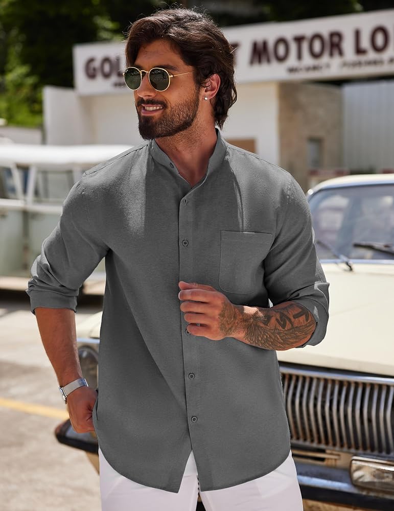 Banded Collar Shirt: Mens long sleeve button down shirts with unique stand collar, button closure, chest pocket. Long sleeve oxford shirt great for sun protection and also convenient for rolled cuffs to further its easy-going feel