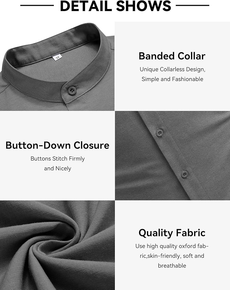 Mens Mandarin Collar Shirts: Mens collarless dress shirt is made of high quality cotton fabric. Feature with skin friendly, lightweight and breathable, which can provide you optimal comfort wearing experience and keeps you cool and relaxed all the time