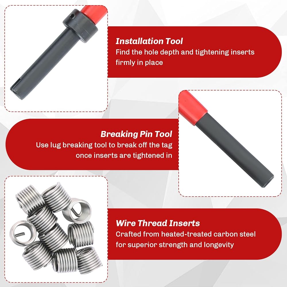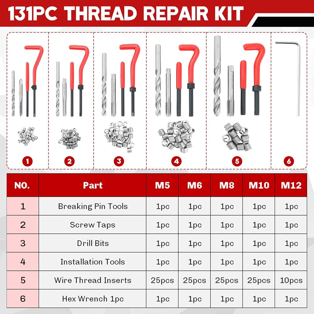 【Comprehensive Thread Repair Kit】131-Piece metric helicoil thread repair kit includes 5 x Twist Drill Bits; 5 x Break Pin Tools; 5 x Installation Tools; 1 x Hex Key; 5 x Taps; 110 x Wire Thread Inserts.