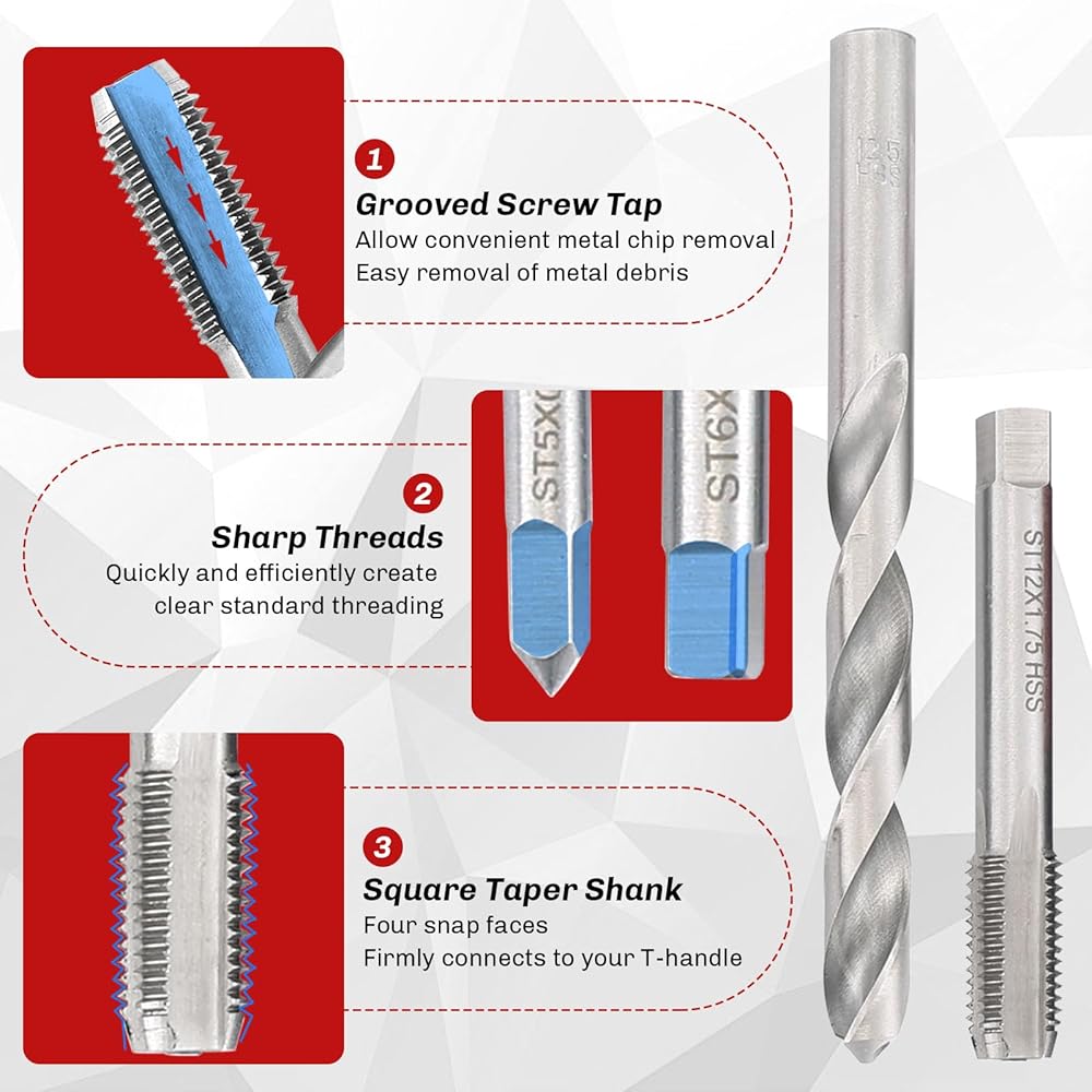 【Easy to Use】 This thread repair kit features a user-friendly design, with 135° drill bits that minimize drilling pressure and rubber-coated tools for a comfortable grip. This makes the kit accessible and easy to use for both professionals and DIY enthusiasts.
