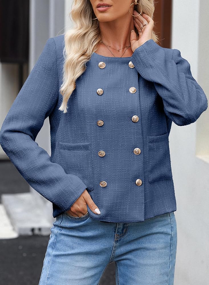Feature: The double-breasted and open front, front side pockets,round collar,combined with the cropped length, create a fashionable and modern look that suits any occasion.