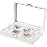 This watch box has a large clear glass lid that allows you to find the right watch at a glance. Each compartment has enough room for most different types of watches and is durable and easy to clean!