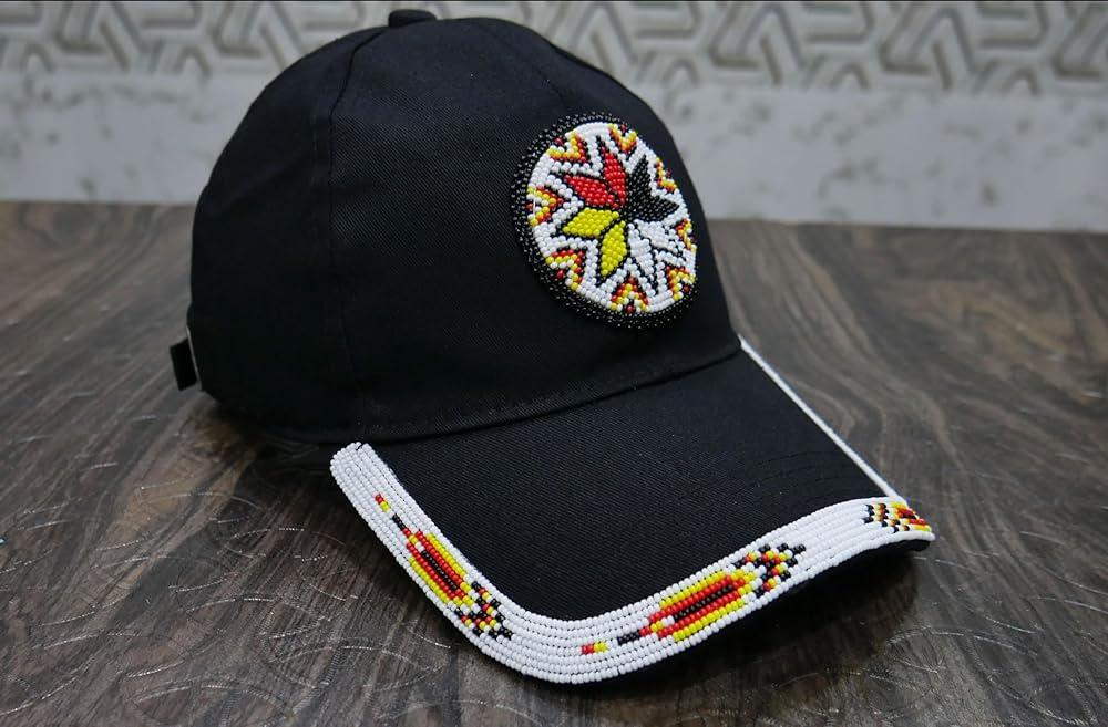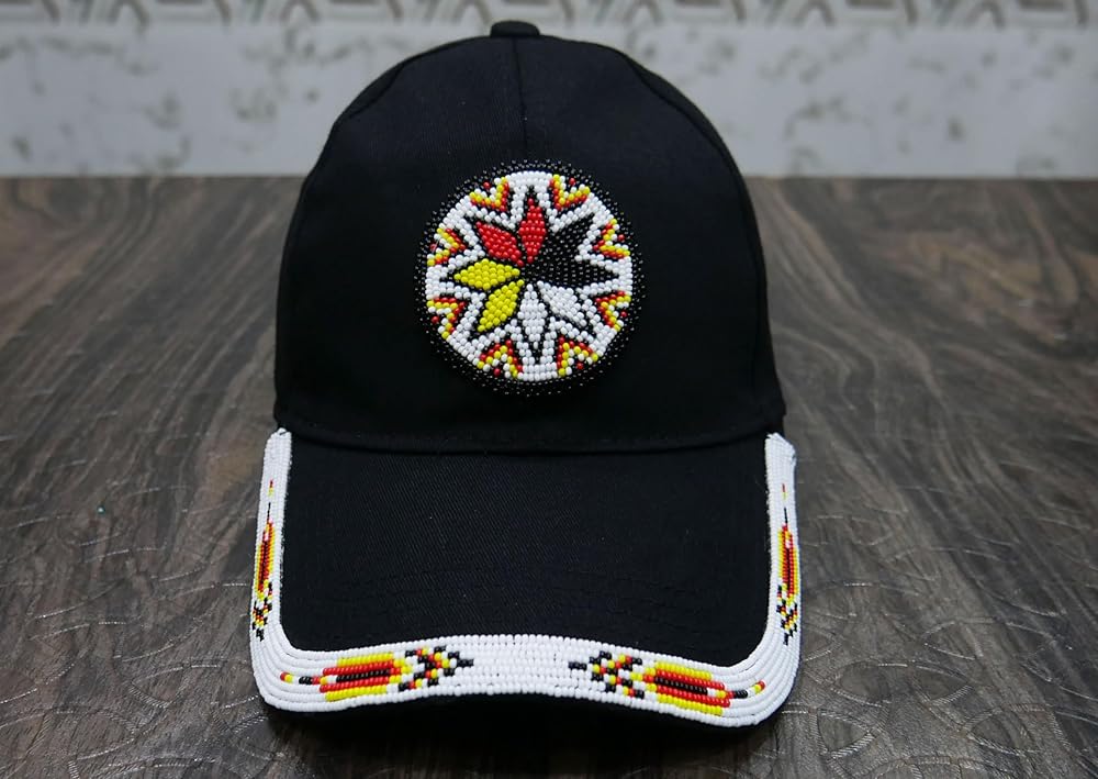 CRAFTED WITH CARE: Handmade cap features an intricate beaded design depicting Native American symbols of strength and heritage.