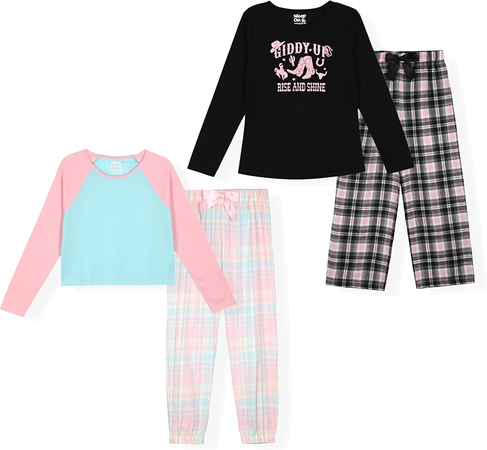 Introducing the Sleep On It Girls 4-Piece Pajama Sets, the perfect combination of comfort, style, and warmth for your little one. These delightful pajama sets include two pairs of plaid pajama pants and two sleep shirts, thoughtfully designed to ensure a cozy and restful night's sleep. The pajama pants are crafted from high-quality fleece fabric, offering a soft, warm, and comfortable experience. Whether it's a chilly winter night or just a cool evening, these pants are sure to keep your child snug and warm. The sleep shirts are made from a super-soft, lightweight knit fabric, providing a gentle touch on the skin and ensuring breathability throughout the night. Available in a variety of vibrant colors, including Navy, Pink, Berry, Green, and Black, these sets add a pop of color to bedtime routines. With sizes ranging from 7 to 16, there's a perfect fit for every girl, making these pajamas ideal for siblings or friends who love to match. These versatile pajama sets are perfect for bedtime or lounging around the house on a lazy weekend morning. They are also an excellent gift choice, bringing joy and comfort to any child's sleepwear collection. Treat your child to the cozy, stylish comfort of the Sleep On It Girls 4-Piece Pajama Sets and make every night a delightful experience.