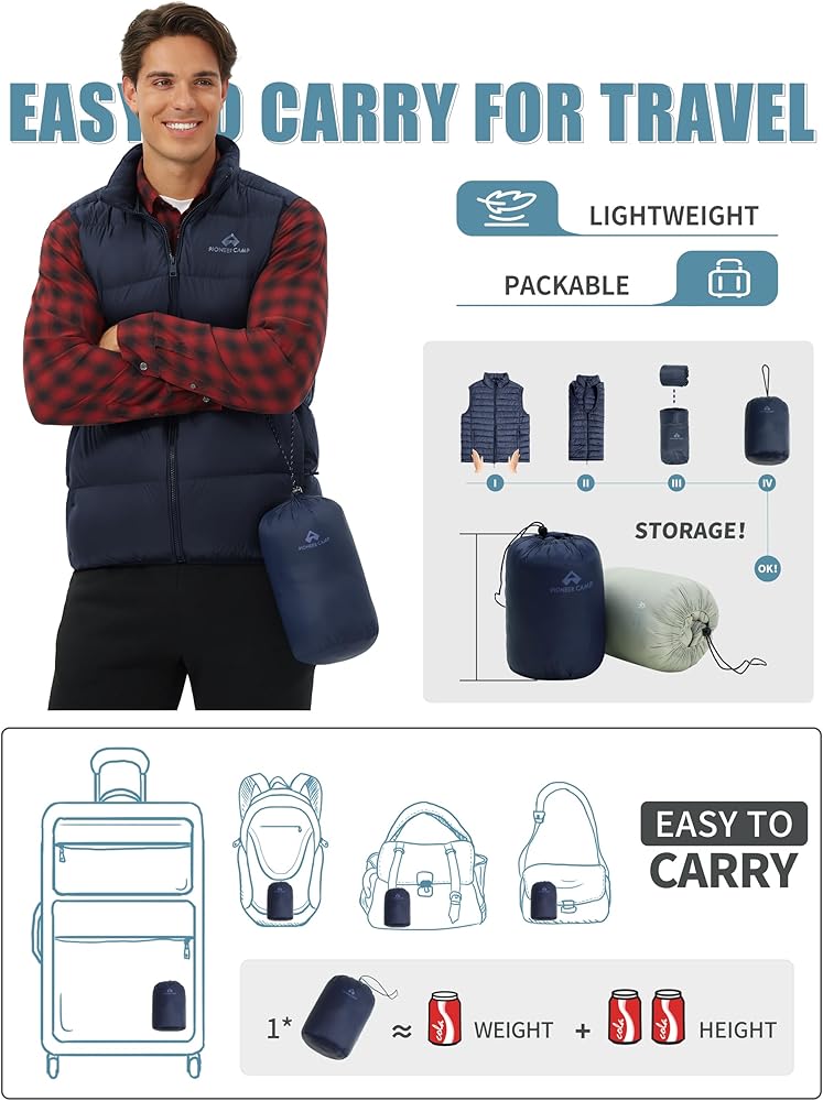 Lightweight and Packable: Insulated vest with duck down filling, weight is only 300g , and carry easily to packs neatly into included carrying bag with drawstring closure. mens bubble vest with 2 zipper hand pockets deep enough for 6.7" phone and 2 large pockets inside can hold bulky items such as thermos, gloves