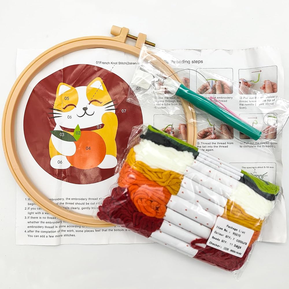 1.Package & Size: Hoop size is about 8" diameters. One punch needle embroidery starter kit includes embroidery cloth (with pre-printed patterns), embroidery threads, embroidery hoop, embroidery pen and instruction.