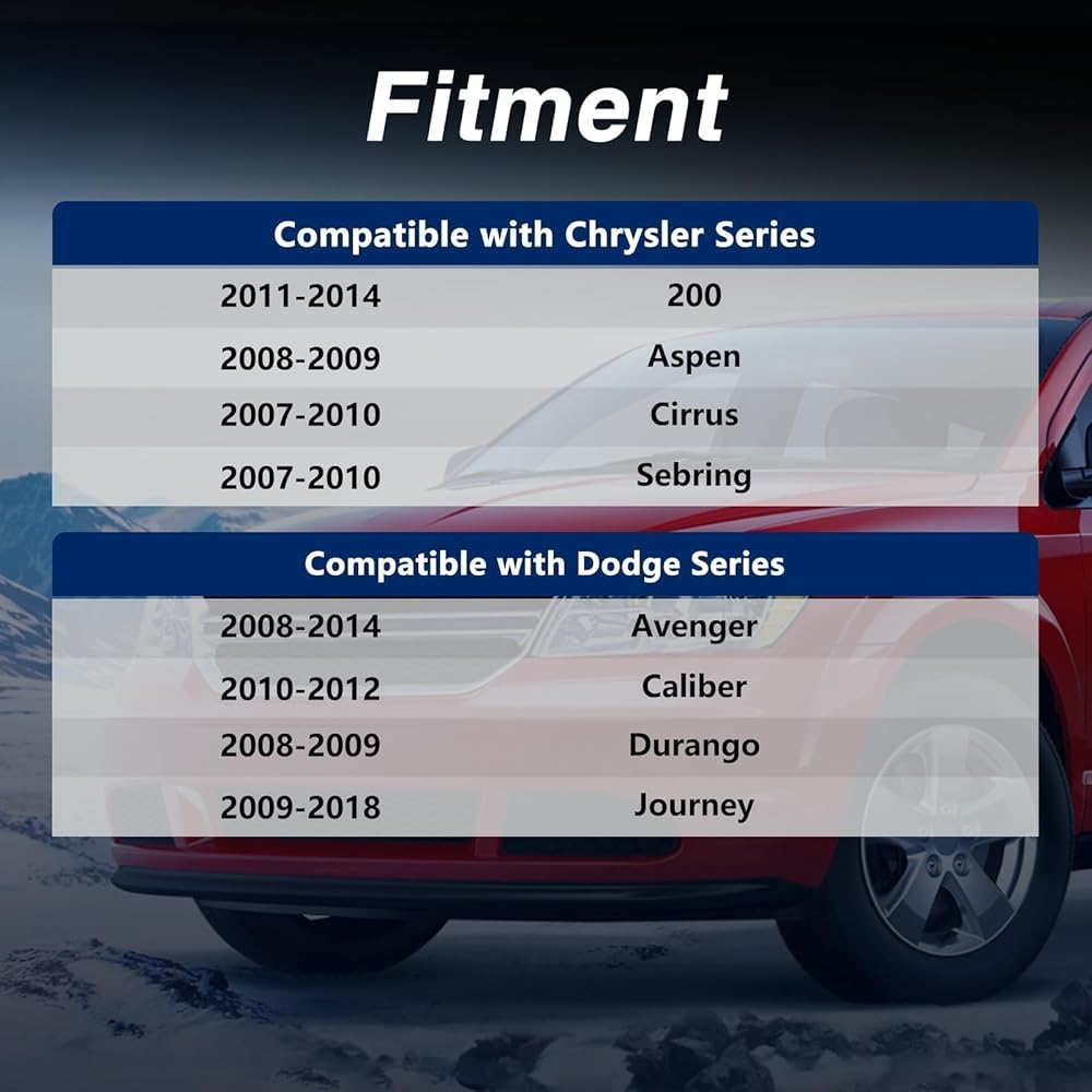【Fitment 1】: HVAC heater blend door actuator fit for Chrysler series:Chrysler 200 2011- 2014,Chrysler Aspen 2008-2009,Chrysler Cirrus 2007-2010 ,Chrysler Sebring 2007-2010;Fit for Dodge series:Dodge Avenger 2008-2014, Dodge Caliber 2010-2012, Dodge Durango 2008-2009, Dodge Journey 2009-2018