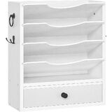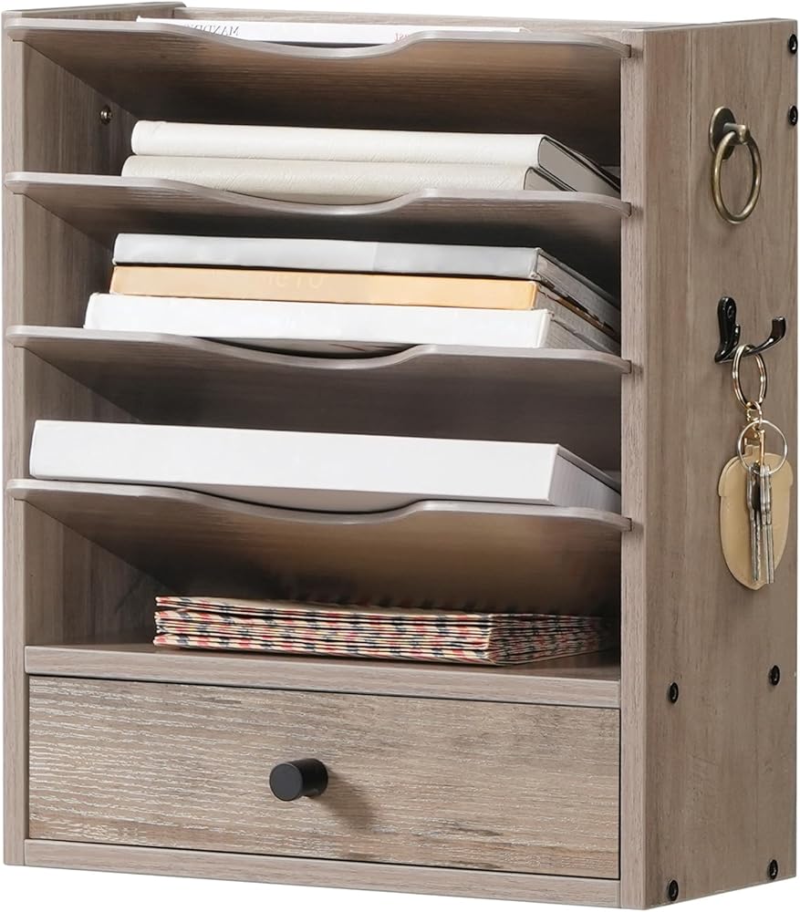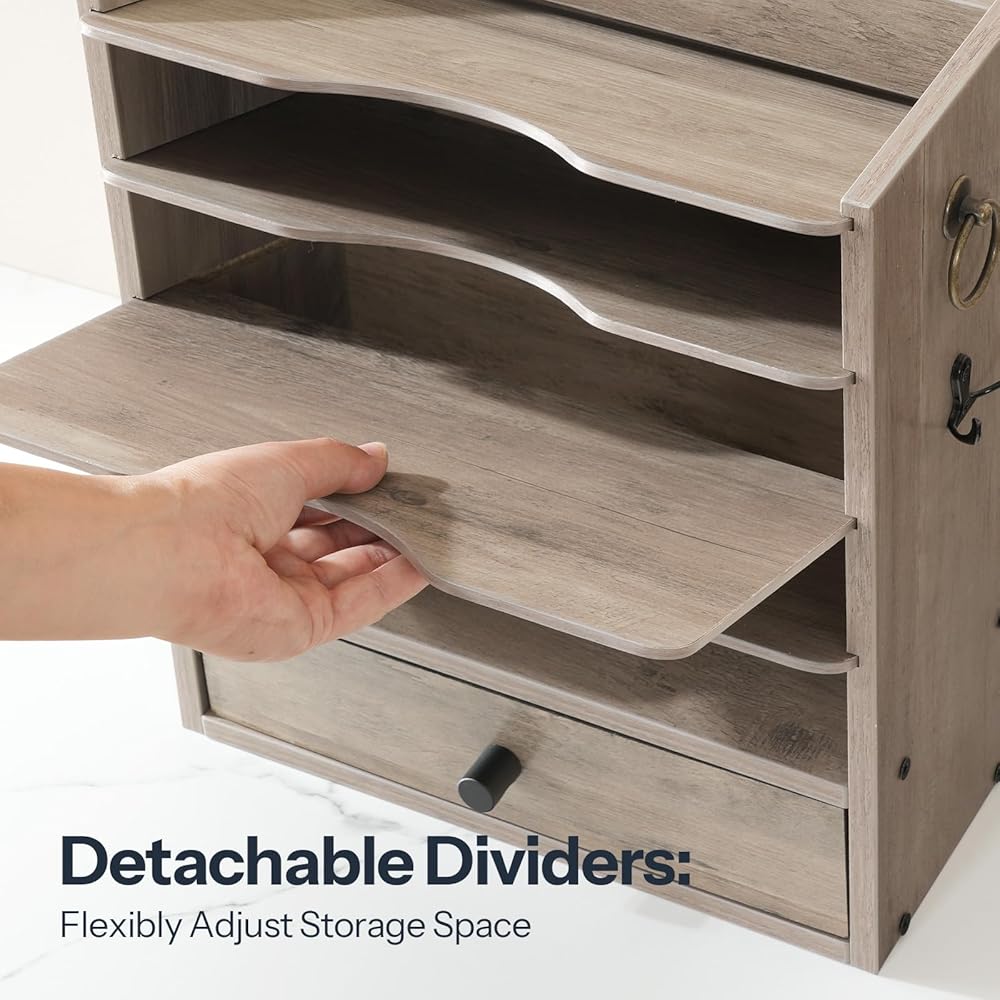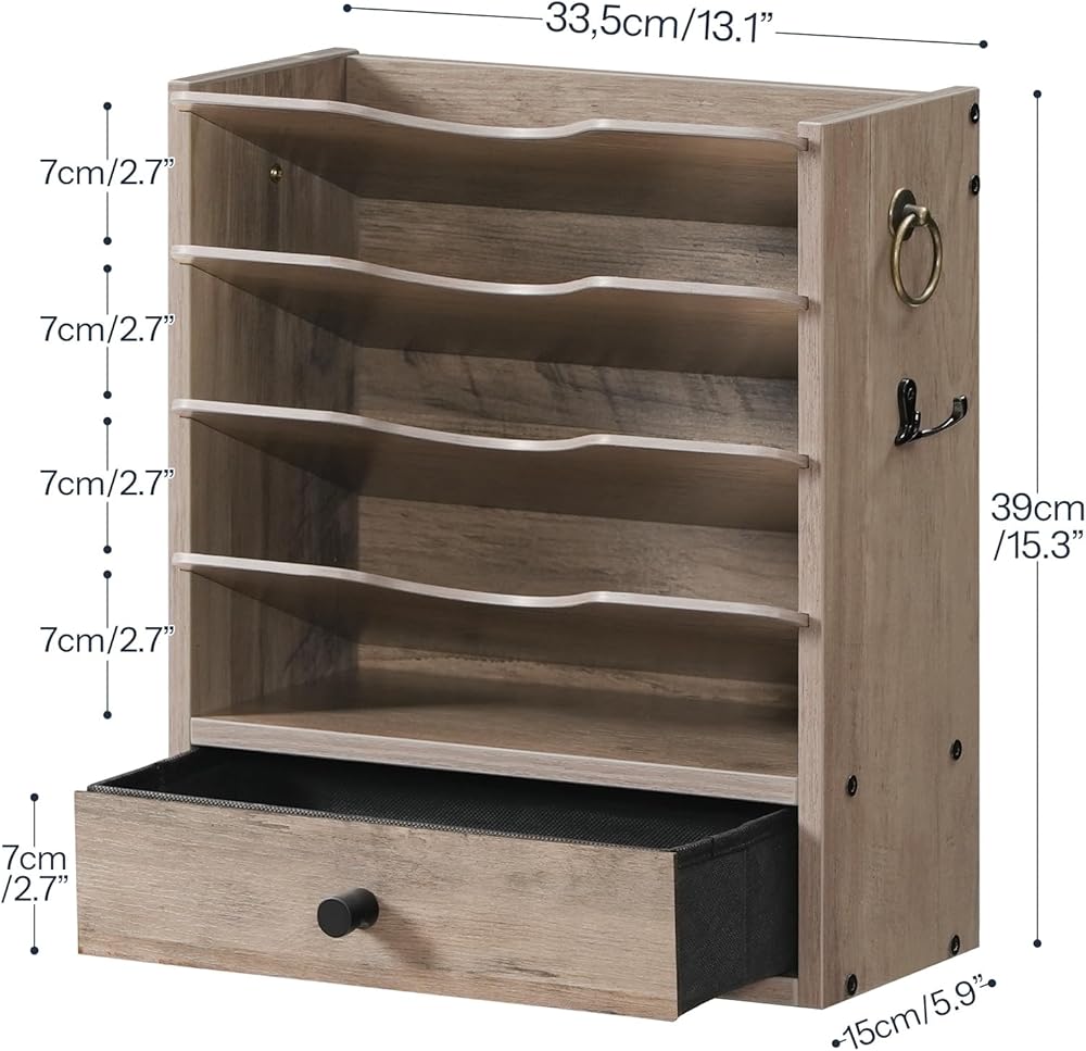 Versatile Storage: This mail organizer is designed to meet your diverse storage needs with its 4 shelves, 1 fabric drawer, and 2 double-ear hooks, holding office supplies such as files and other items with easy access and clear visibility