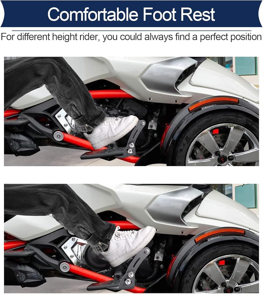【 RIDE WITH COMFORT】 As you know for Spyder F3 is wind buffeting on feet when traveling at highway speeds. Our bolt on foot rest extensions allow you to center feet across the stock peg and the foot peg extensions for a much more balanced foot position while cruising and improve riding safety. The foot peg can also be used as highway pegs for more comfortable leg position when traveling on freeways or long rides.Especially for riders with long legs, it is a must-have highway pegs.