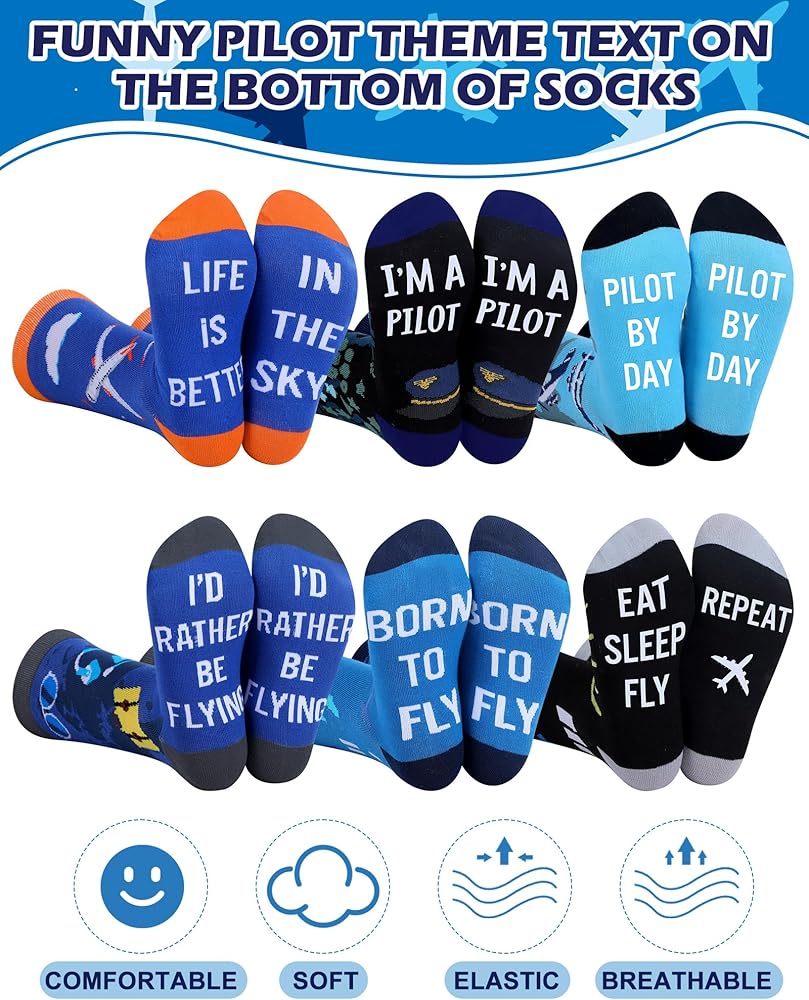 • Aviator Themed Socks: our men's pilot socks are decorated with airplanes, white clouds, airways, and flight paths, which can give you a sense of openness and yearning for freedom; In addition, a fun message is printed on the bottom of each pair of socks: " I'D RATHER BE FLYING" , " LIFE IS BETTER IN THE SKY" , " EAT SLEEP REPEAT FLY" , etc.