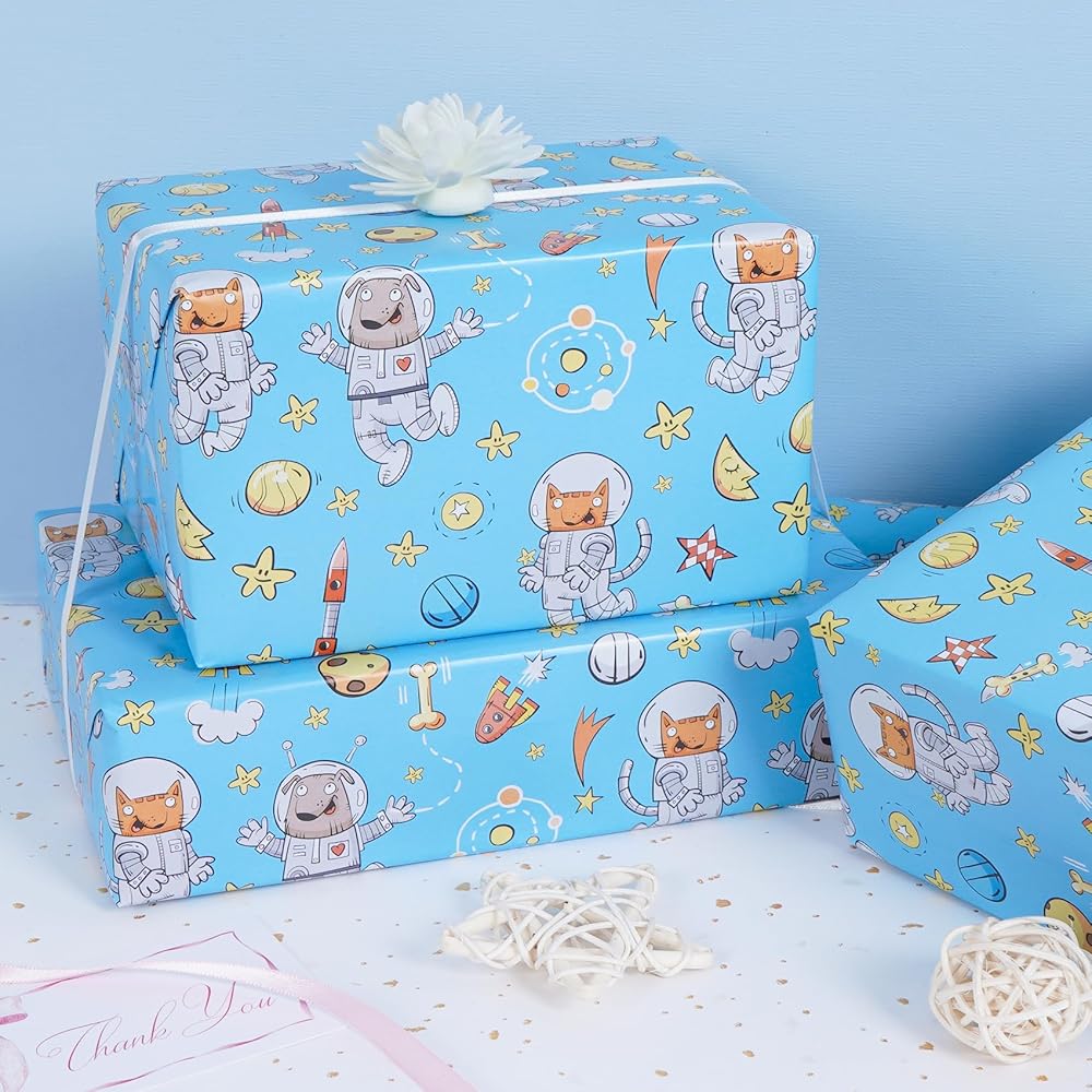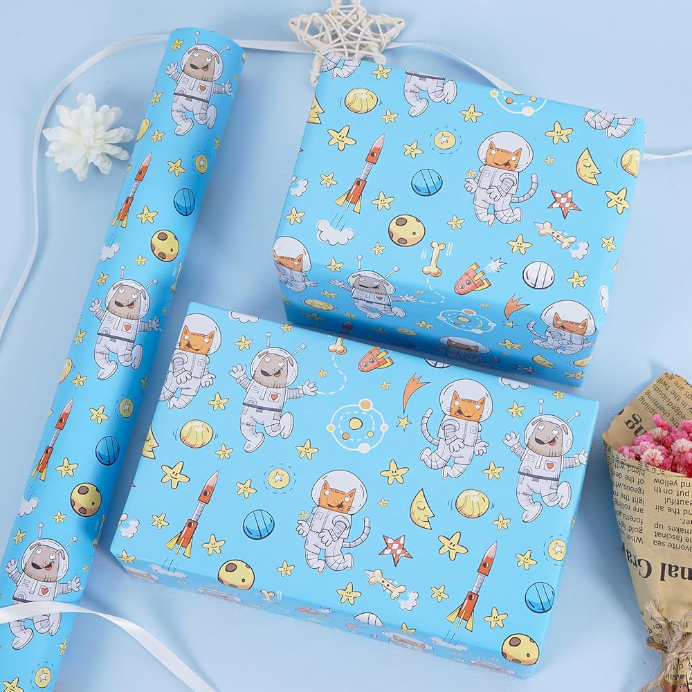 RayofSun Space Dog Wrapping Paper Roll -17 Inches X 16.5 Feet Mini Roll, Blue Funny Astronaut Dog Cat Starry Sky Rocket Birthday Gift Wrap for Kids Boys, Girls, Baby Shower, Christmas, Holiday