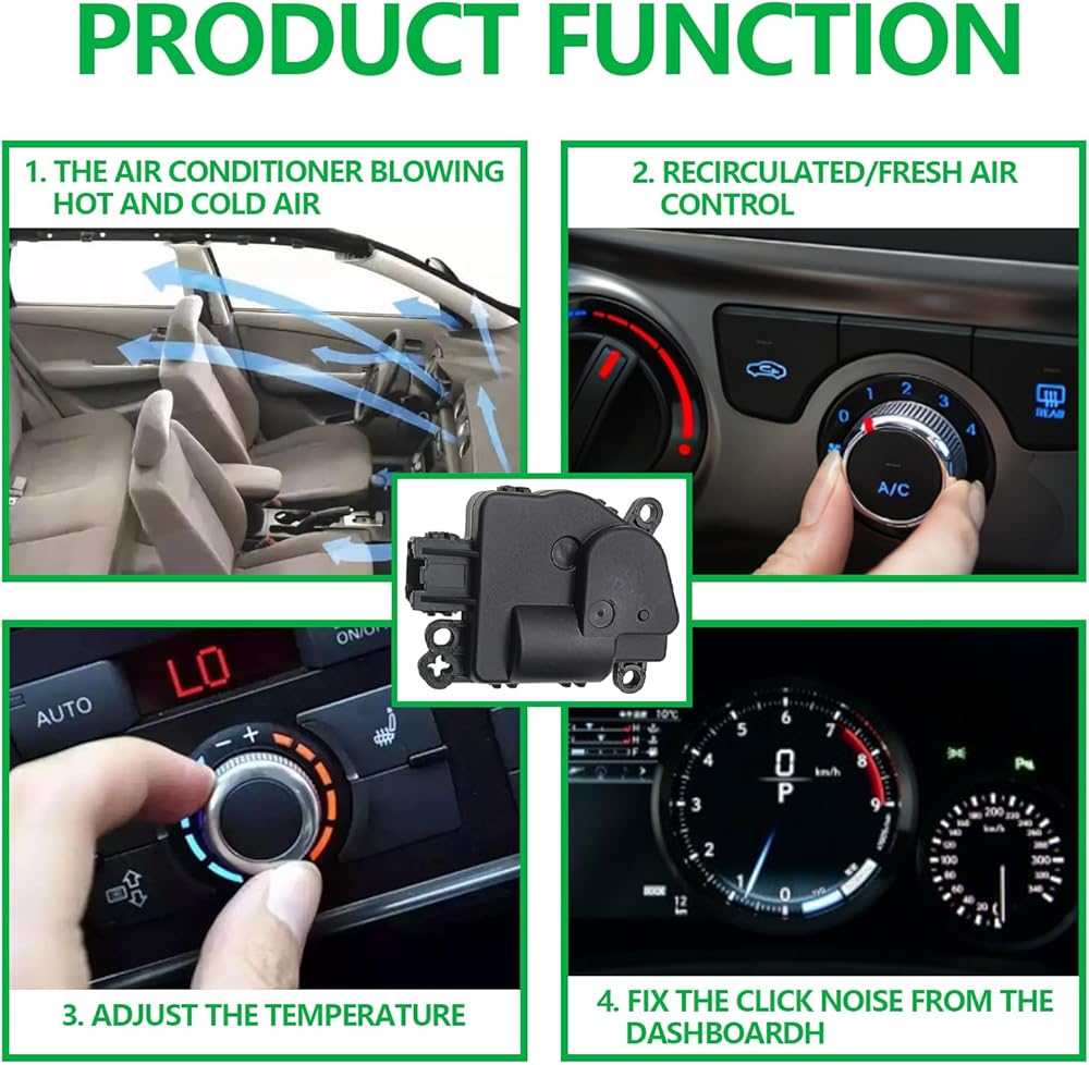 PRODUCT ACTION:When there was a strange noise from the air conditioning or unable to adjust the temperature inside the car,you need to replace the Blend Door Actuator. The Blend door actuator as an electric motor in the car,controls the air from AC vents from AC vents,up or down the temperature,also influences the right and left passenger compartment temperature settings. It helps the vehicle's HVAC system operates,delivering comfortable temperature to you.