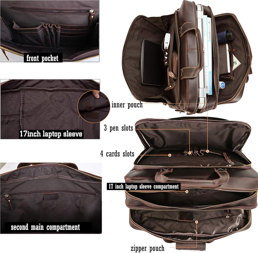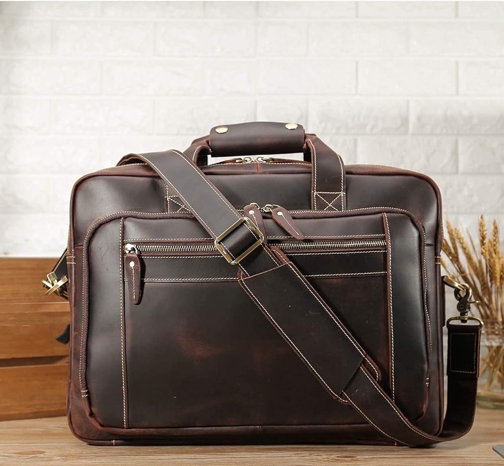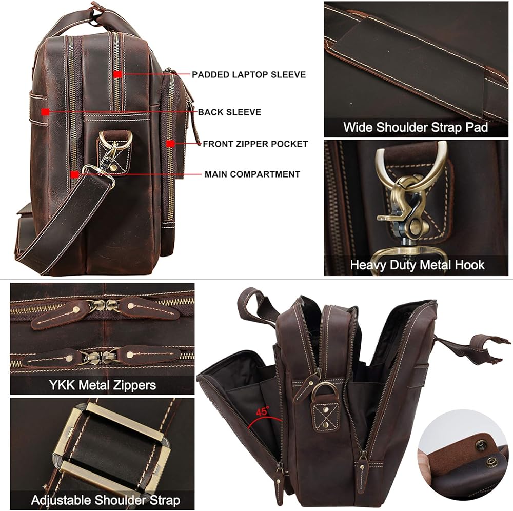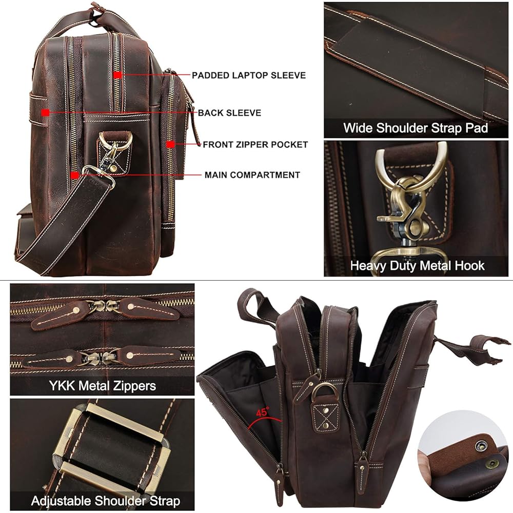 【Quality Material】Made of thick cowhide leather processed with crazy horse leather technology, this men's laptop briefcase is featured with outstanding durability and weathered vintage look. The leather grows brighter and shiny with age. ykk zippers, which can bear 1000 times pull strength test. Well stitched sturdy lining and heavy duty hardware can last long time.