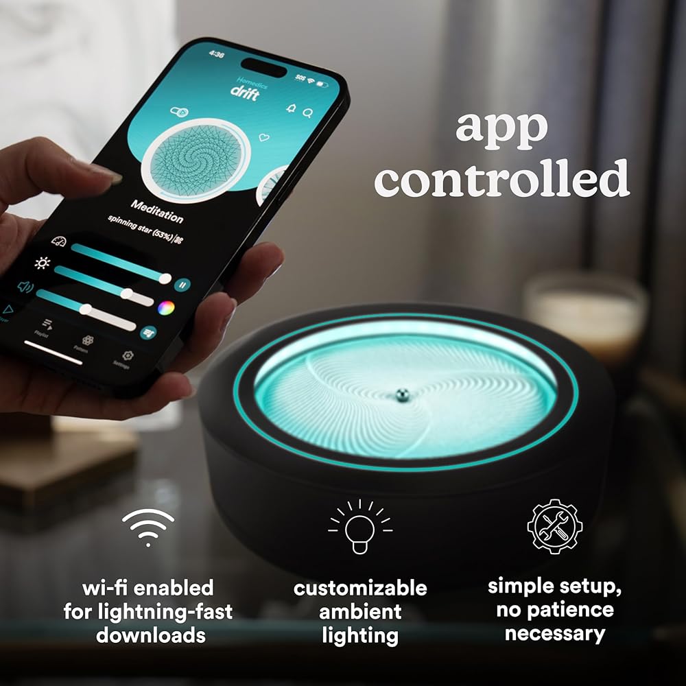 Introducing the same pause-worthy drift, now in a more compact size. Perfect for smaller spaces and packed with all the same features as previous drifts, the Homedics® 11” drift sandscape helps you downsize without downgrading your tranquility. Designed for modern living, this drift sits neatly on a desktop, console, or side table to help declutter your mind and your space. The metal sphere takes your eyes on a soothing journey through 100s of ever-changing patterns and colors, elevating your space and mind, and leaving you free to daydream, focus, and create. Use the free drift app to customize your calm with total ease. Choose from 100s of patterns, light programs, sounds, and even guided meditations that immerse you in complete relaxation. Individually controlled smart LED lights help showcase mesmerizing light programs like sunsets, rainstorms, light dances, and much more. The Homedics 11” drift sandscape is Wi-Fi enabled for lightning-fast setup and updates, while our new WhisperLite™ microbeads allow for smooth, quiet pattern creation — perfect for those who crave true calm. As sleek and stylish as ever, this is the drift you've been waiting for. So go ahead, invite calm in.