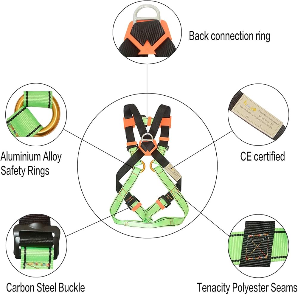 ※Absolute safety—Polyester material is mechanically strong. It has high tensile strength, a low friction coefficient, and it's light. This makes the harness durable and strong . Up to 450lbs Weight limited. Breaking strength: 22KN. Waist 19.7" to 25.6"; Leg max to 19.7". CE Certified Standard:EN353~1:2014, EN358:2000, EN361:2002+AC:2017, EN362:2004. Note: The date on the label is the date of manufacture.