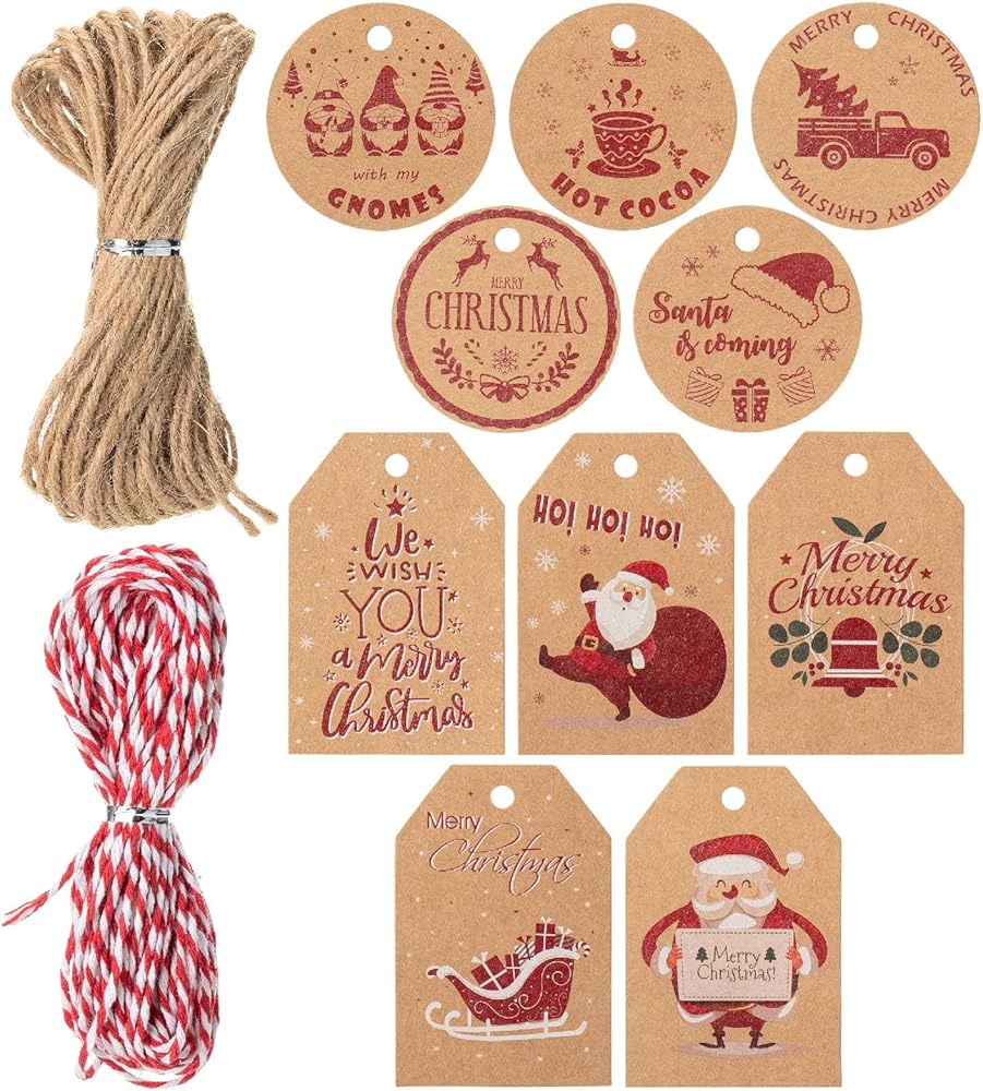 The set includes both round and rectangular tags, pre-punched for easy attachment, and comes with 2 hemp ropes for a classic and eco-friendly way to tie them to your gifts.