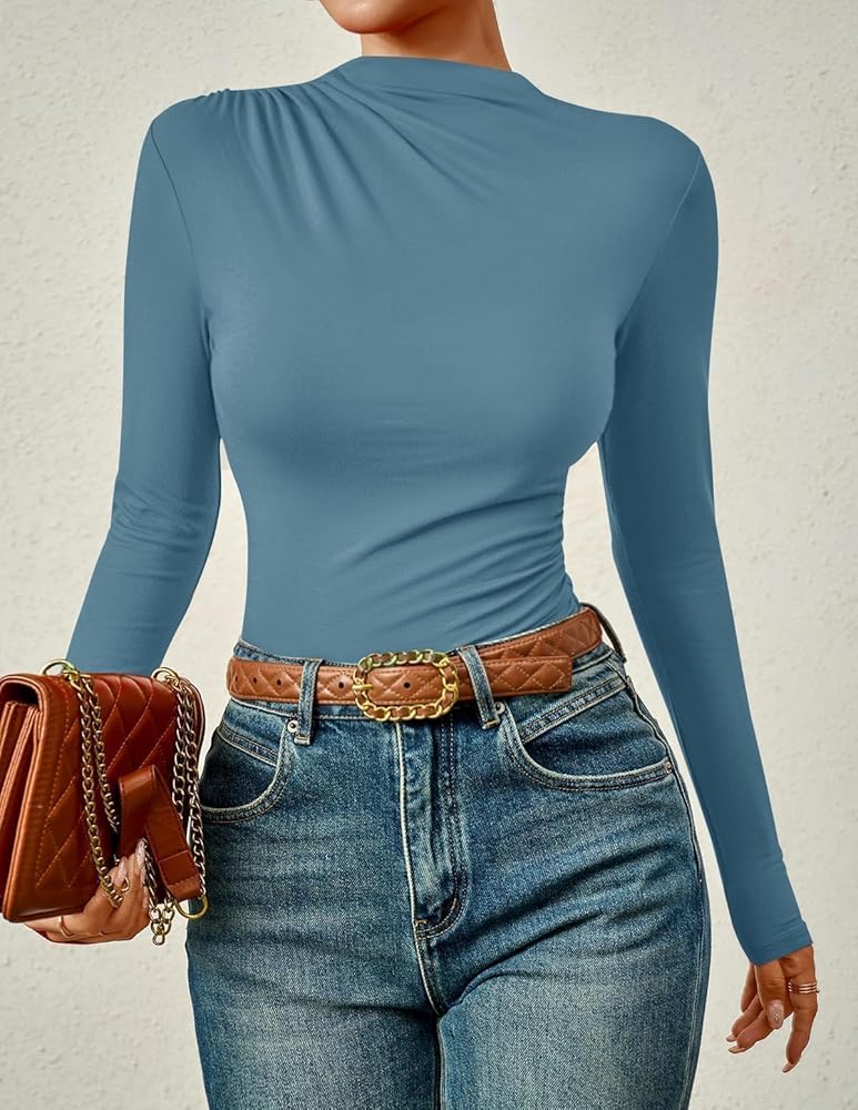 Feature: long sleeve, pleated design on right front shoulder, ruched left side, high neck, slim fit, solid color, trendy and elegant. This ruched top is a must-have for your wardrobe.