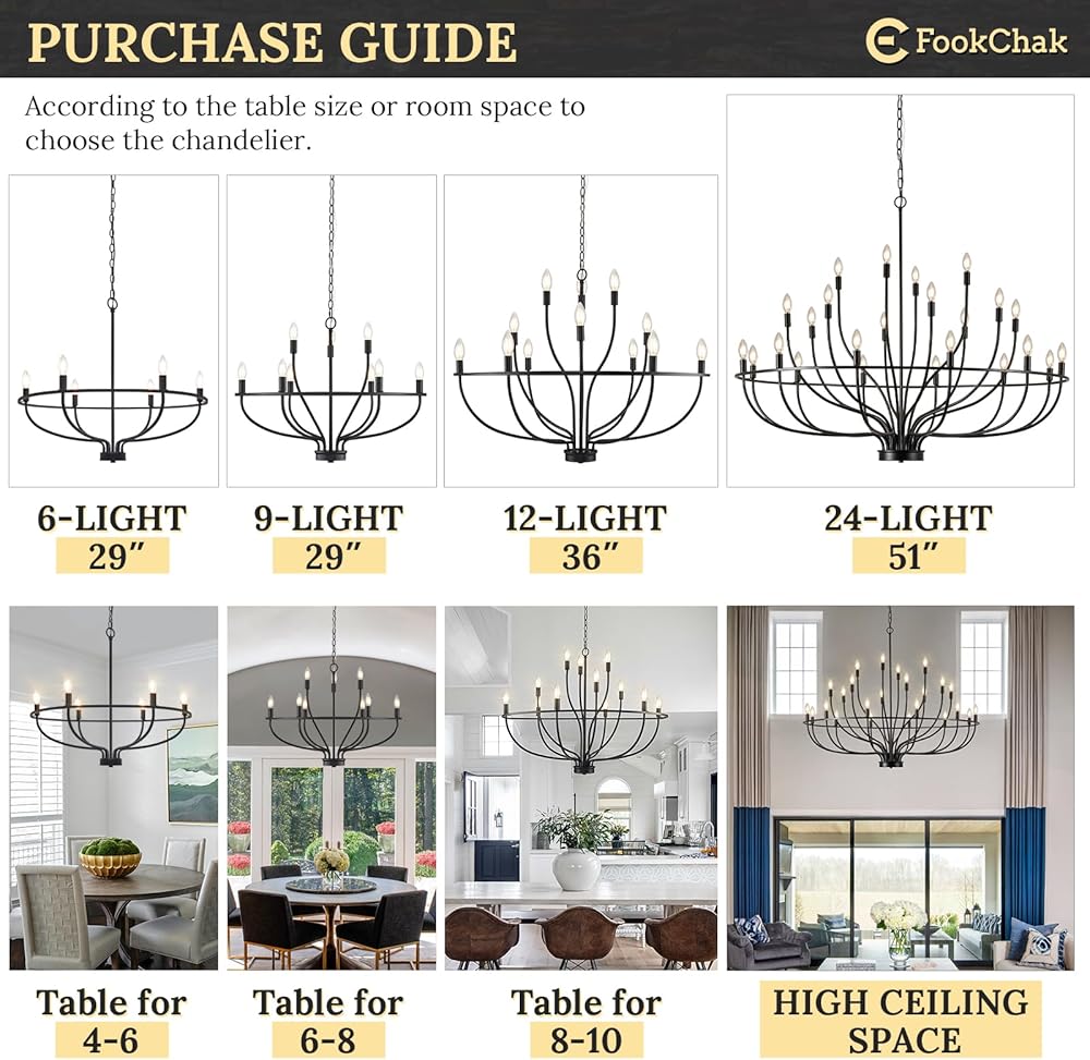 E12 Base - FookChak vintage brass chandelier is compatible with E12 bulb (BULB NOT INCLUDED). This gold dining room chandelier is packed with a full accessories kit and user manual for easy and quick installation.