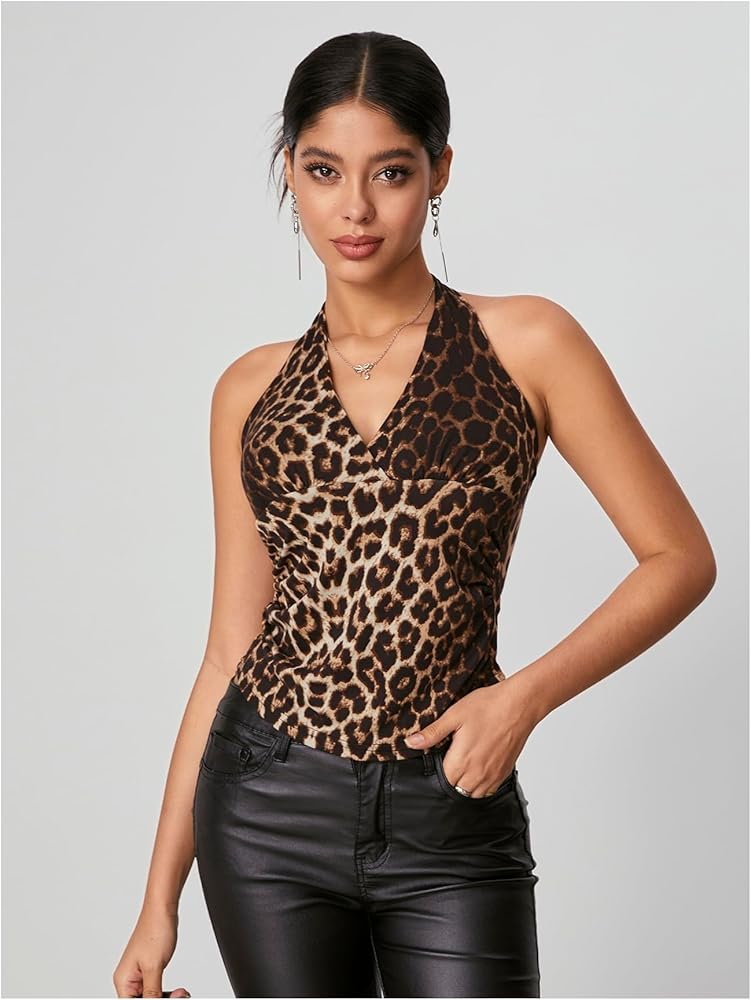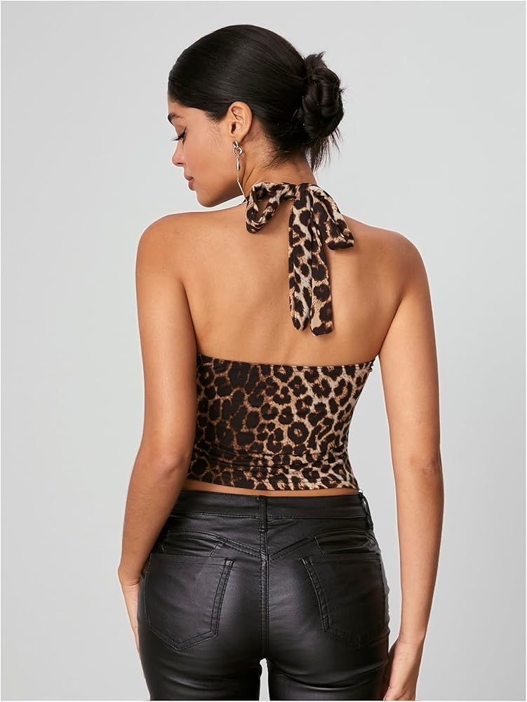 - Features: Y2K leopard print, halter neck, backless, ruched, crop length and slim fit.