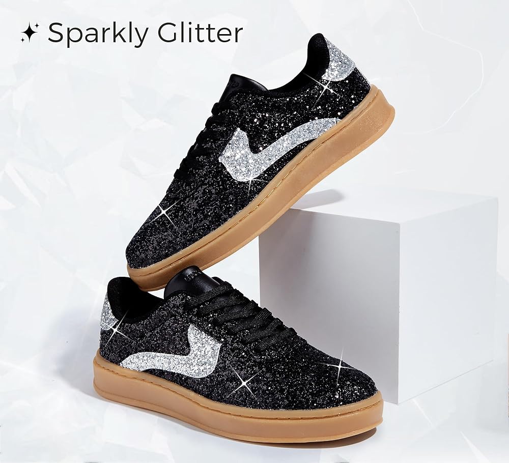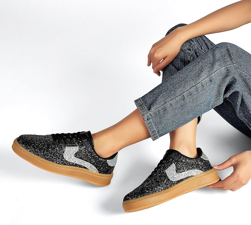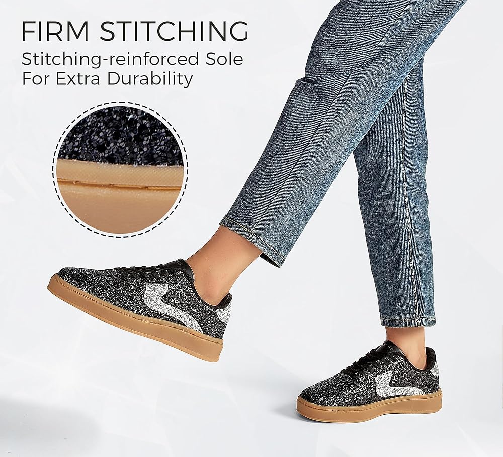 【Non slip】: These women's glitter sneakers include a durable rubber outsole, offering excellent traction on various surfaces, ensuring stability and safety with every step.