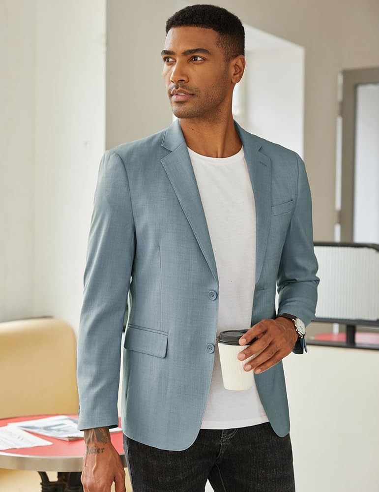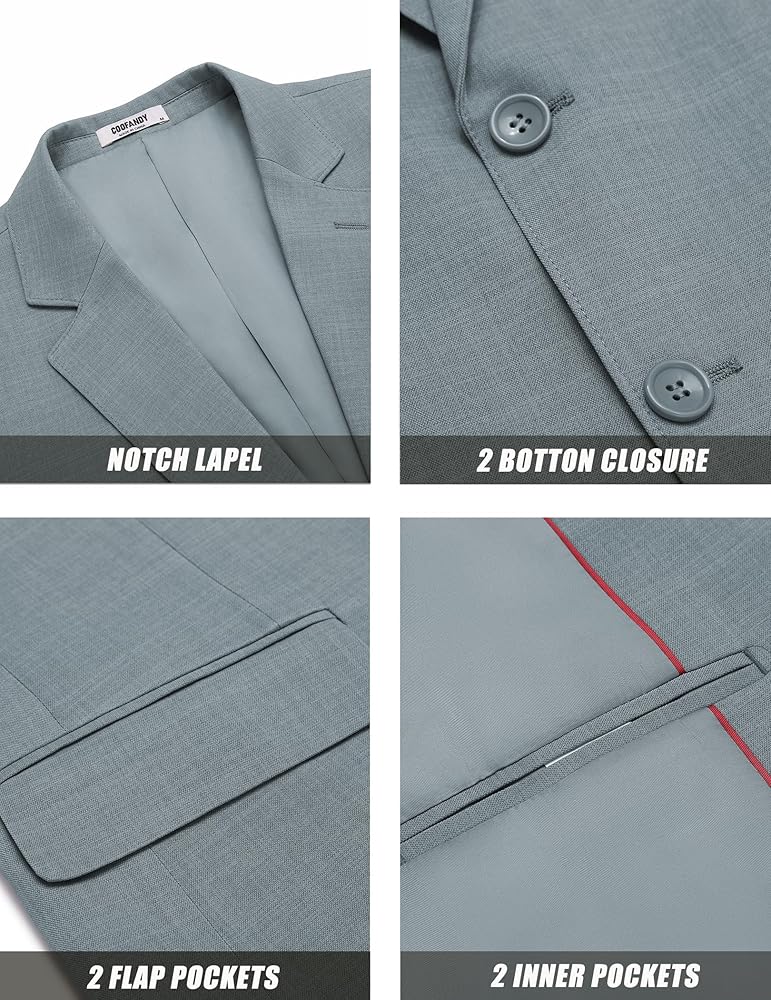 CLASSIC DESIGN: This mens slim fit blazer features notched lapels, two button closure, three cuff buttons, two side flap pockets, two inner pockets, a chest pocket, and shoulder pad design, combining fashion and elegance perfectly