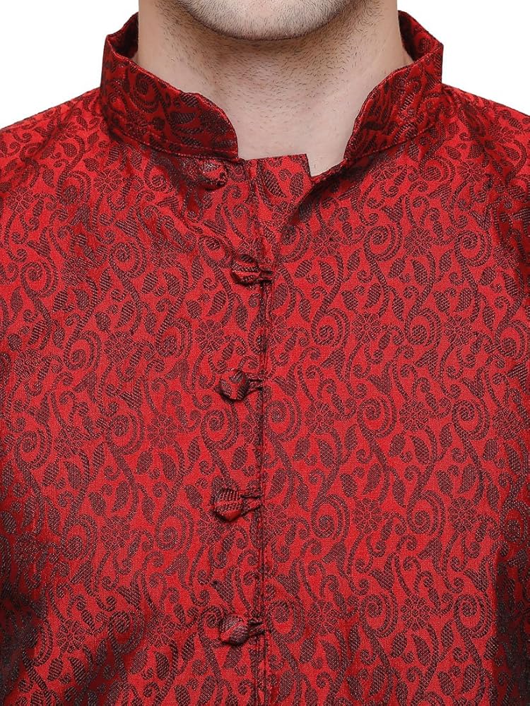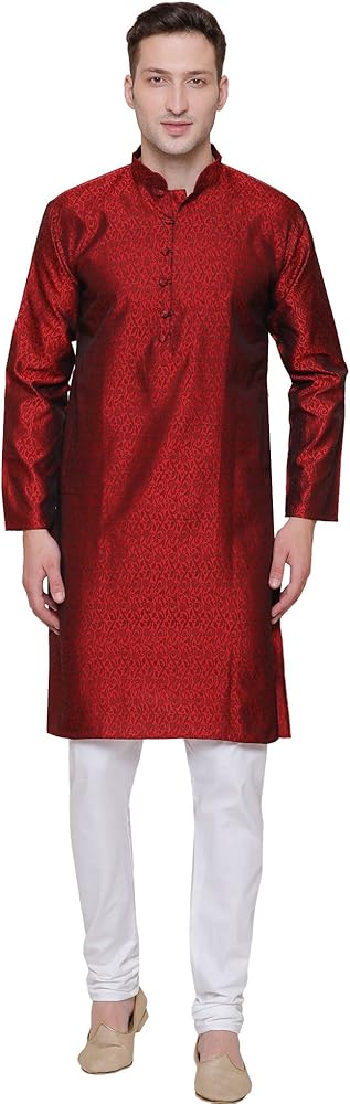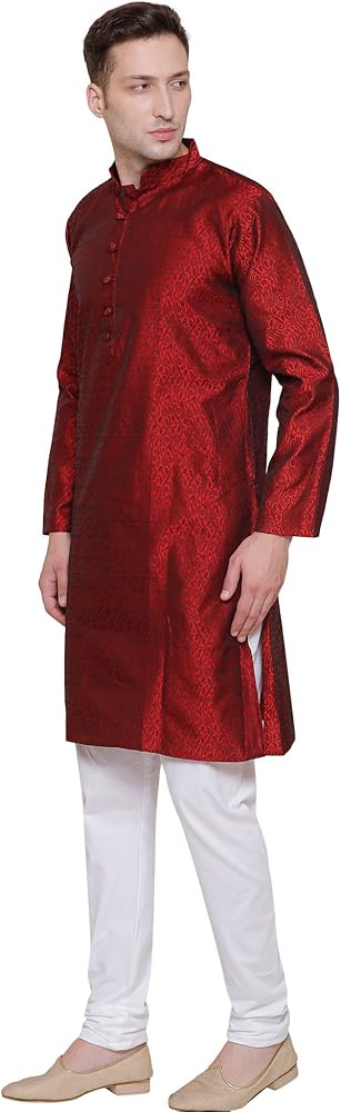 Kurta pajama set in jacquard silk fabric, ethnic men's party wear from India. Loose comfortable fitting makes it a great wear. Comes with complimentary free size white trouser (churidaar pajama) in soft fabric with drawstring in waist. Dry clean recommended. Pajama is a lightweight drawstring trouser which is traditionally white or Light Brown in color. Highly comfortable and eminently suited to all climatic conditions, its use is widespread throughout the Indian subcontinent. Kurtas are often worn with jeans. Please check the measurement as per information below before you order.